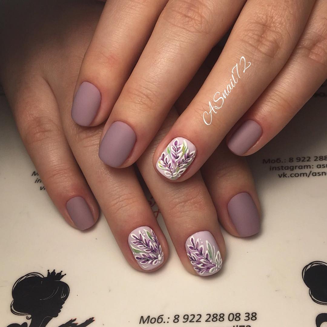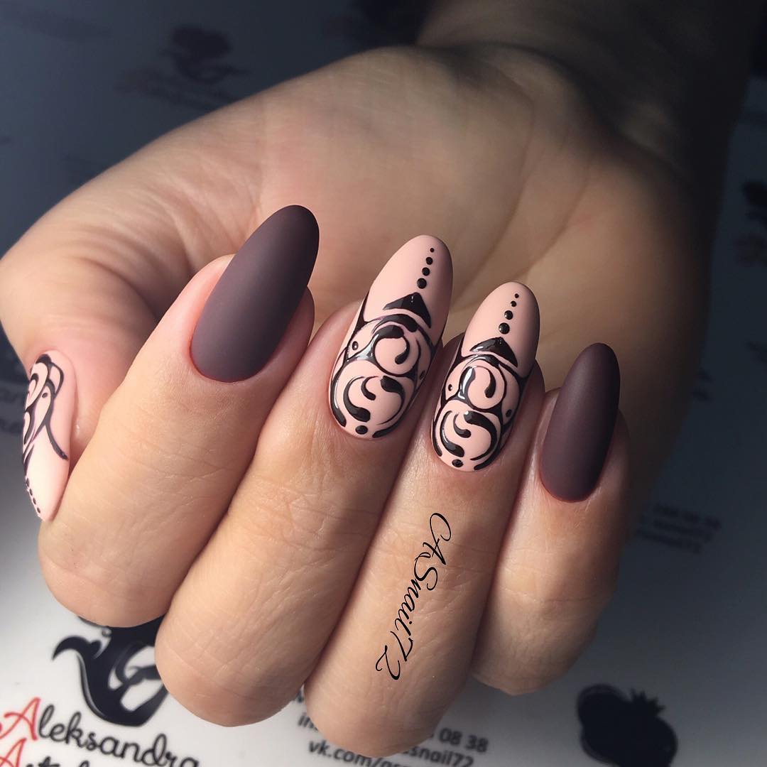 Очень красиво выглядит матовый ноготь, на котором глянцевым топом нанесен орнамент. Используйте нейтральный цвет, а рисунок создайте более ярким, контрастным лаком.