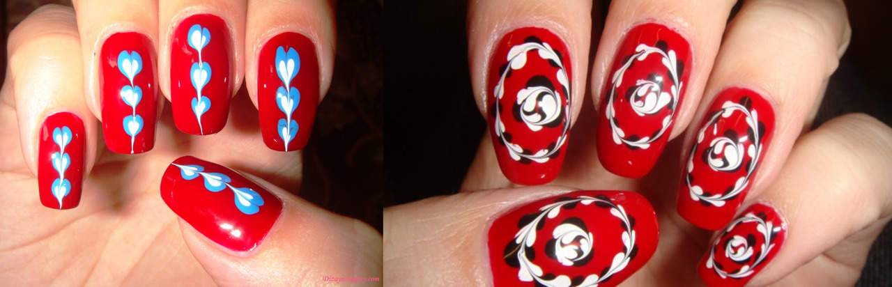 Но обоих изображениях вы видите рисунки на красных ногтях, выполненных иглой. Нанесение узора выполняется поэтапно в следующей последовательности: