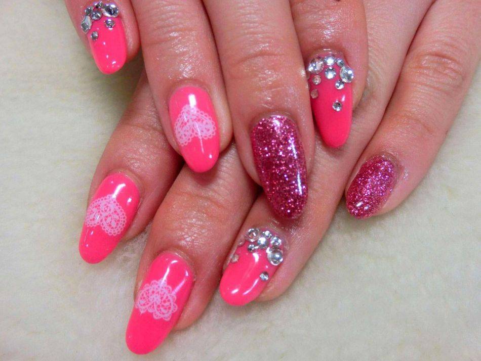 Так же сердечки на ногтях можно просто выложить, используя стразы, бульонки или другой подходящий декор. Дополнить такой маникюр с сердечками можно, используя лаки подходящих цветов или блестки. Технология украшения ногтей декором такая же, как и при декорировании ногтей фимо.