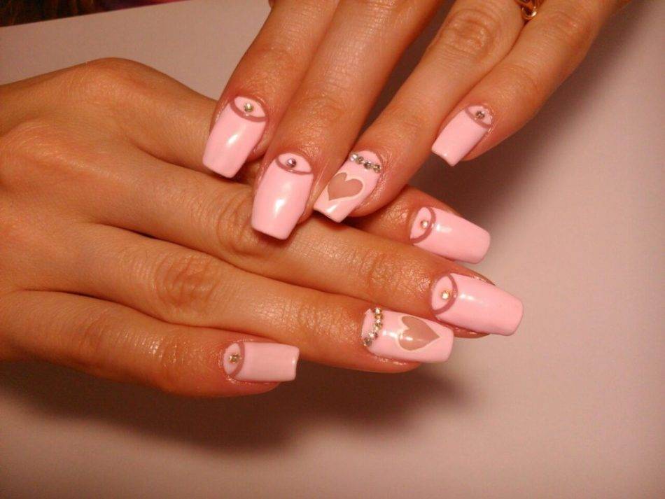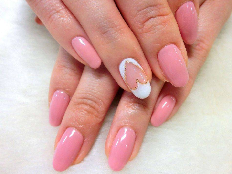 Розовый маникюр с прозрачным сердцем