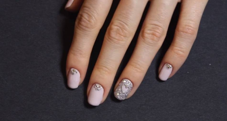 В этом варианте Вы можете применить готовые стразики, которые имеют форму сердечек. Покройте ногти прозрачным, белым или бежевым лаком, и наклейте на каждый ноготь стразы. Можете наклеить по одному стразику, либо сразу по несколько.