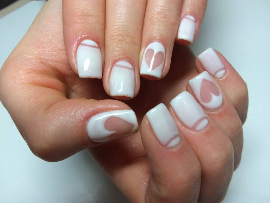 Можно сочетать классический французский маникюр и сердечки.