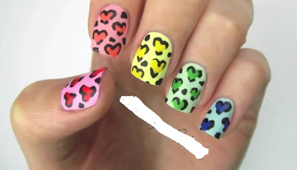 Нанесите на ногти блестящий лак. На каждом ногте нарисуйте сердечки, но сделайте их разных цветов, к примеру, на одном ногте нарисуйте красное сердце, на другом – синее, на третьем – розовое и так далее.