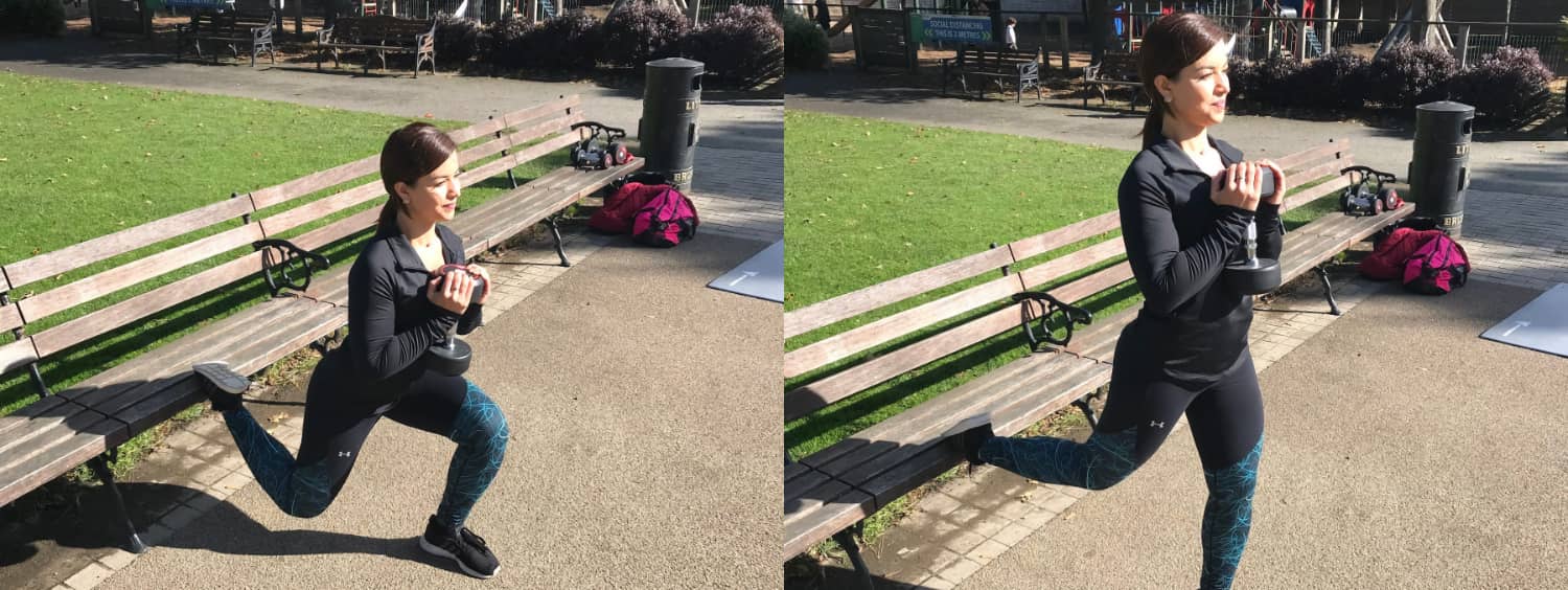 - Одну ногу поставьте прямо, а другую расположите на скамье позади себя