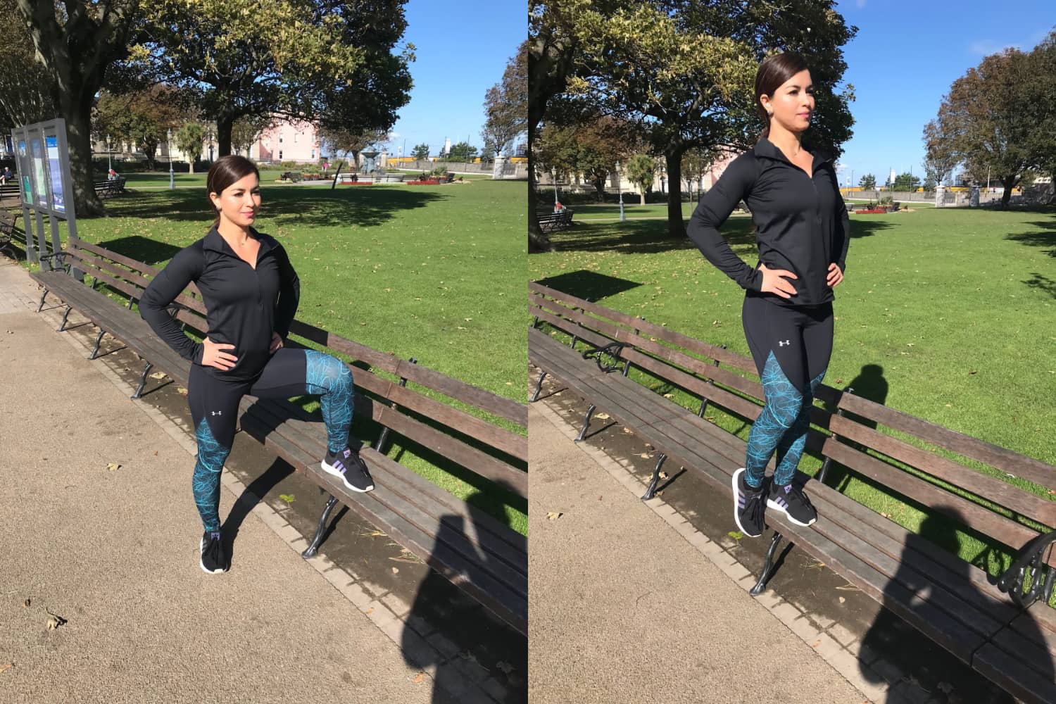 - Согните ногу под углом 90 градусов и поставьте на скамью, держа другую выпрямленной