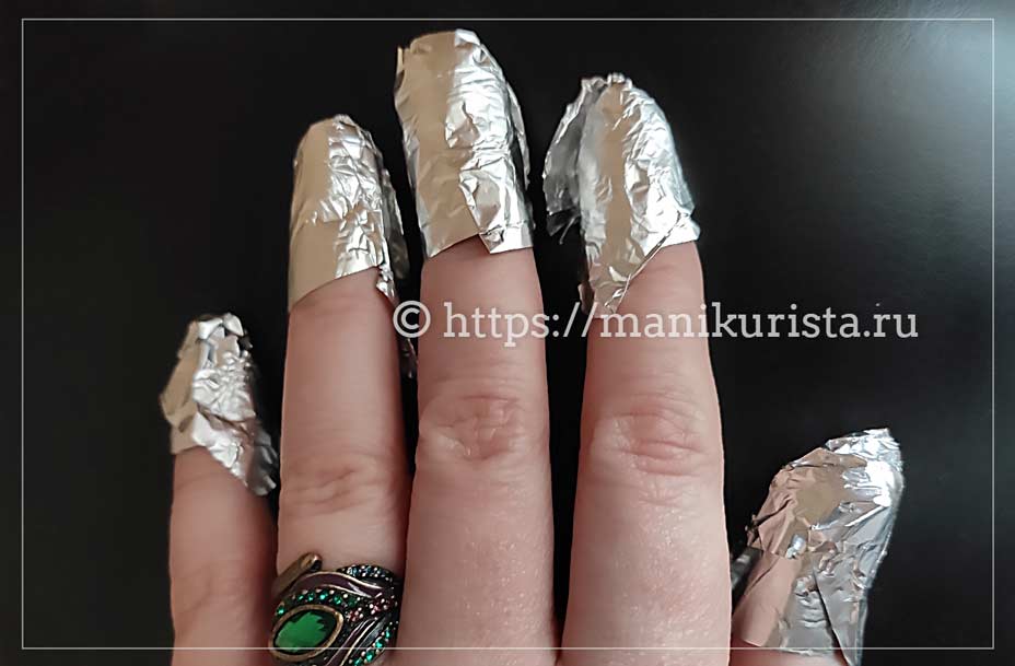 Смачиваем их жидкостью для снятия гель-лака и накладываем на опиленный гель лак. Предварительно рекомендуется смазать кожный покров вокруг ногтей кремом, вазелином или маслом. Далее оборачиваем кончики пальцев вместе с пропитанными «компрессами» фольгой и ждем 5-10 мин. Оборачивать в несколько слоев не обязательно. Жидкость не испаряется, т.к. в ней мало ацетона, а фольга нужна для сохранения тепла пальцев. Такремувер растворяет эффективнее, сокращается время воздействия на ноготь и прилегающую кожу.Заключительный этап. Снимаем фольгу и видим вздутое покрытие