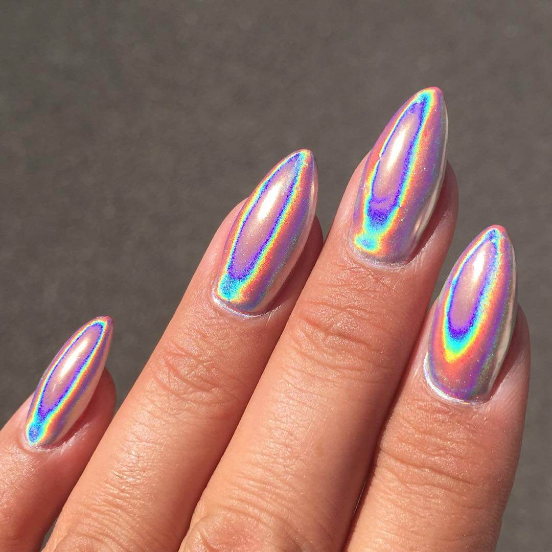 7. Holographic или 3D — лак для ногтей с эффектом голограммы. При ярком свете красиво переливается, создавая визуальный объем.