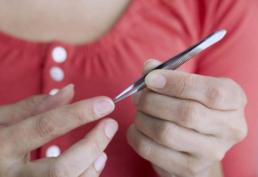 - Если занозу видно, край инородного тела торчит, подцепите его пинцетом и потяните под тем же углом, под которым заноза вошла под ноготь. Старайтесь не тянуть резкими движениями, поскольку можете сломать занозу: в таком случае извлекать ее будет гораздо сложнее.