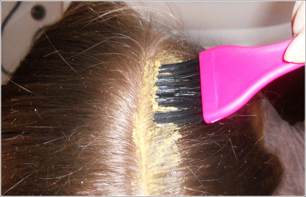 Ингредиенты помещают в емкость из пластика либо дерева и тщательно перемешивают. Составу дают настояться 3-4 минуты и наносят на увлажненные пряди у корней, затем распределяют по локонам. Средство удерживается около 1 часа, смывается водой и шампунем.