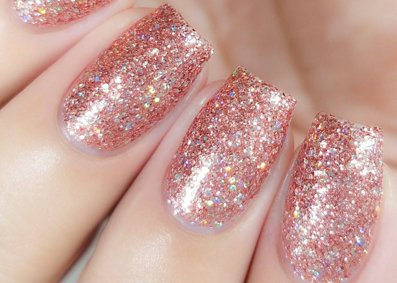 Глиттер является родной сестрой шиммера, но вместо крохотных частиц содержит небольшие блёстки. Подобное дополнение может быть однотонным и цветным, иметь форму круга, прямоугольника, треугольника, сердечек, звёздочек. Снимать с ногтей его тоже проблематично.