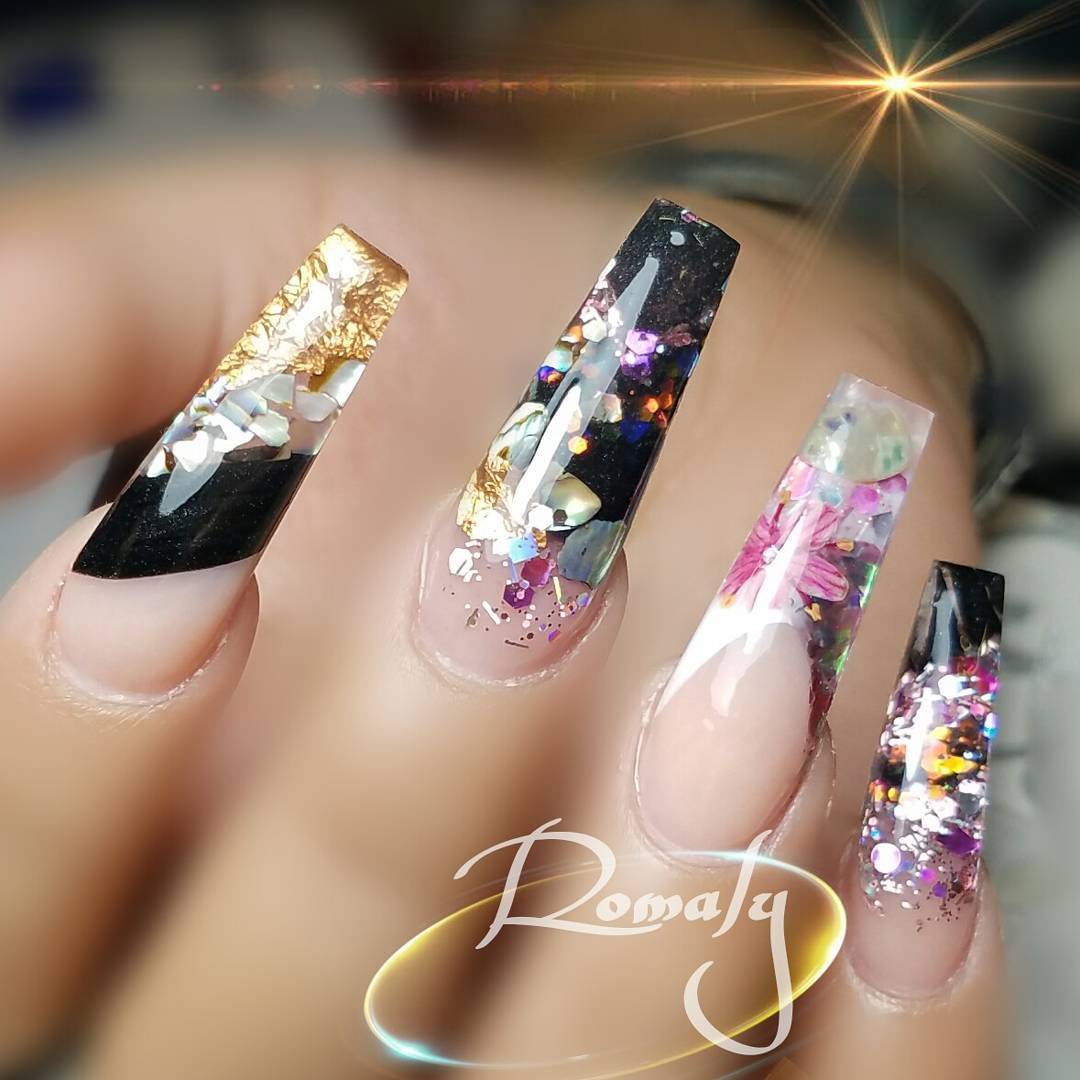 - Можно отнести элементы, обладающие характеристиками, позволяющими перекрыть их прозрачным слоем материала с соблюдением архитектуры ногтя. Их толщина, гибкость, зернистость, материал изготовления не препятствуют выравниванию. В результате элементы декора запечатываются внутри ногтя. Аквариумный слой не будет скрадывать красоту подобного декора, а напротив, придаст объем.