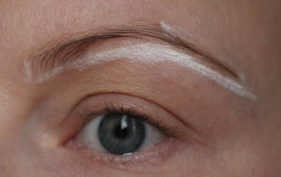 - Наведите светлую полосу под и за пределами контура. Растушуйте, не задевая бровей