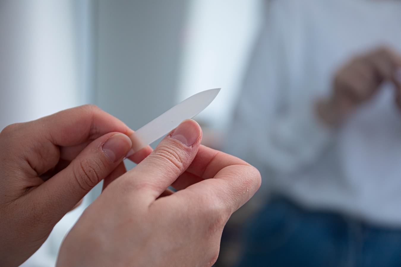 После обработки ногтей кусачками и жезлами, мастер шлифует ногтевую пластину, используя ножницы для запиливания, а затем наносит базу, лак и защитное покрытие.