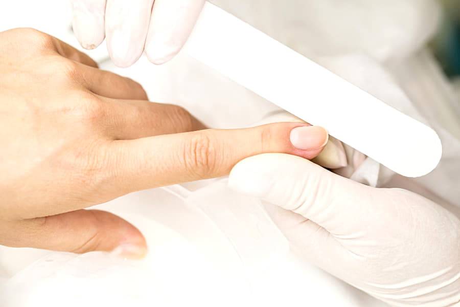 После полной обработки кутикулы на всех пальцах мастер приступает к ногтям. С помощью пилочки можно изменить форму и сделать подходящую длину. Помните, что инструмент должен использоваться в одном направлении. Это предотвратит расслаивание ногтевой пластины. При необходимости можно отшлифовать ногти, чтобы убрать даже мелкие неровности.
