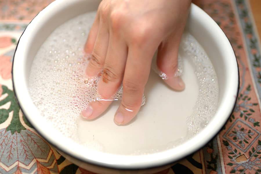 После чего руки необходимо поместить в небольшую ванночку с теплой водой. При необходимости в нее можно добавить соль или мыльный раствор. Такая процедура нужна для того, чтобы размягчить кожу вокруг ногтей. Зачастую процесс занимает не более десяти минут.
