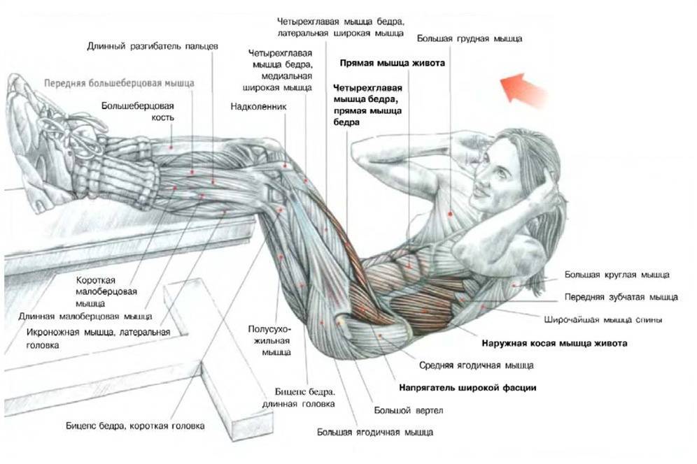 Дополнительно работают квадрицепсы, подвздошные мышцы, предплечья и спина.