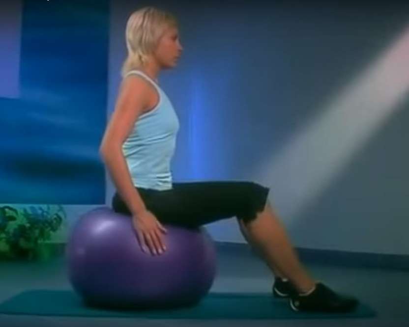 Исходное положение сидя на мяче, ладонями и коленками упираемся в стену. Спина прямая. На вдохе расслабление, на выдохе – сокращение мышц тазового дна.