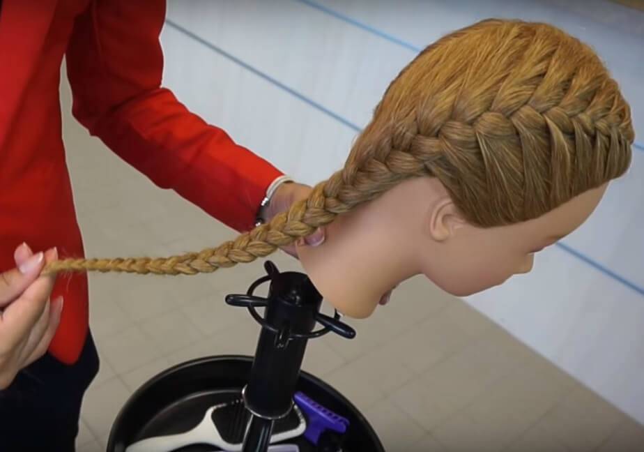 Выполняется плетение косички обычным способом, но во время плетения нужно отделять вспомогательные пряди и подкладывать их под рабочую. В процессе работы пряди следует затягивать так, чтобы получилась тугая коса. В конце нужно закрепить прическу резинкой.