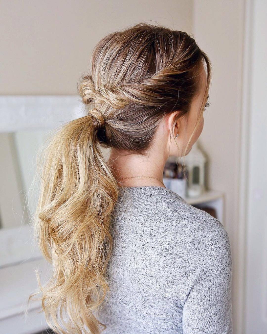 На затылке собираем волосы в хвост, захватывая туда косичку. Небольшой прядкой следует обернуть основание хвоста, чтобы скрыть резинку. Можно еще для надежности закрепить шпильками.