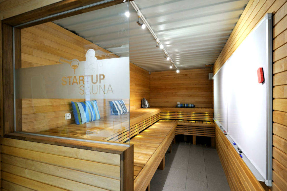 Помещение оформлено просто и приятно — примерно как комната для студсовета, где активисты проводят собрания, вечеринки и кинопоказы, только гораздо больше и аккуратнее. Офисная мебель здесь сочетается с яркими коврами, стикерами на стене и даже диско-шаром. В бывшем гараже поместились 150 рабочих мест, большой конференц-зал, переговорные, офис для совещаний и, что самое главное, настоящая финская сауна. Предполагается, что здесь юные стартаперы смогут расслабиться и придумать кучу отличных идей для своего проекта. Специально для внезапных озарений на стене бани висит доска. Привести мысли в порядок можно и в тренажерном зале — что только не найдешь в этом уютном безразмерном гараже.