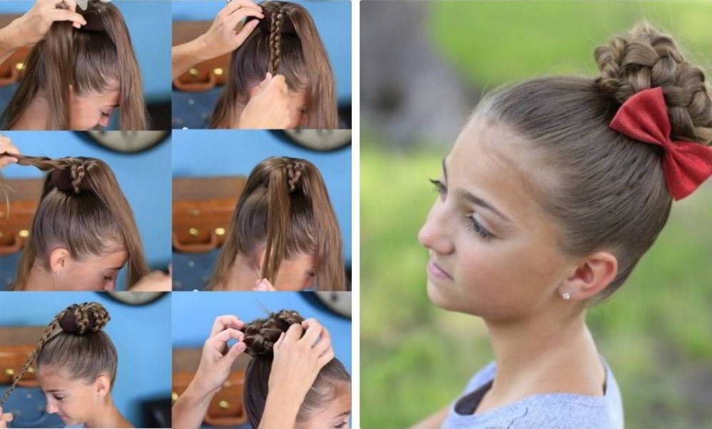 Пучок в сочетании с французской косой смотрится ничуть не хуже. Как сделать прическу в школу в этом стиле продемонстрирует пошаговое фото.