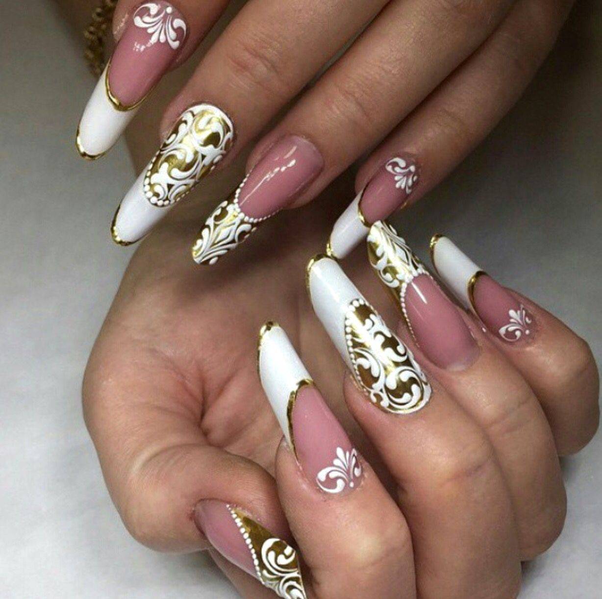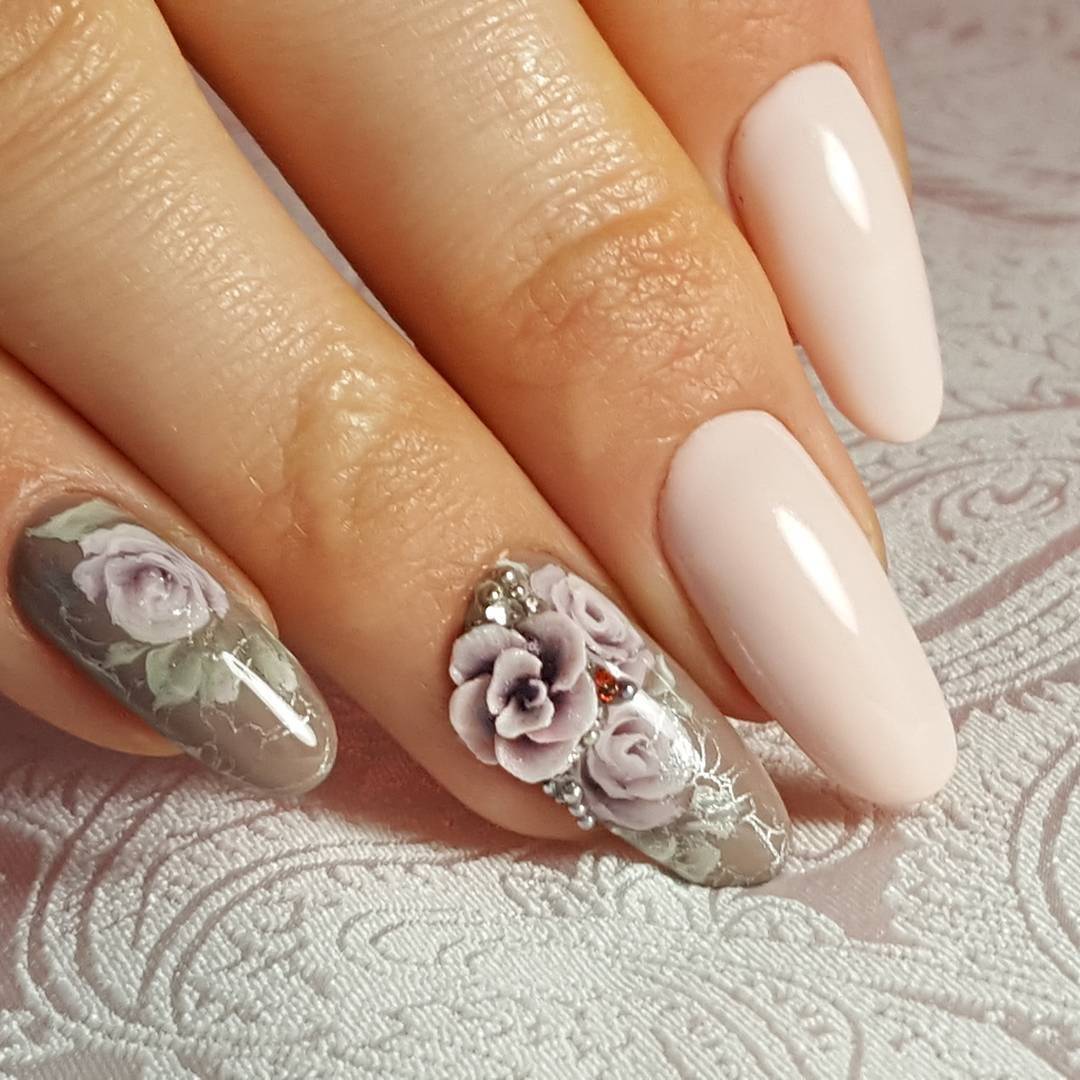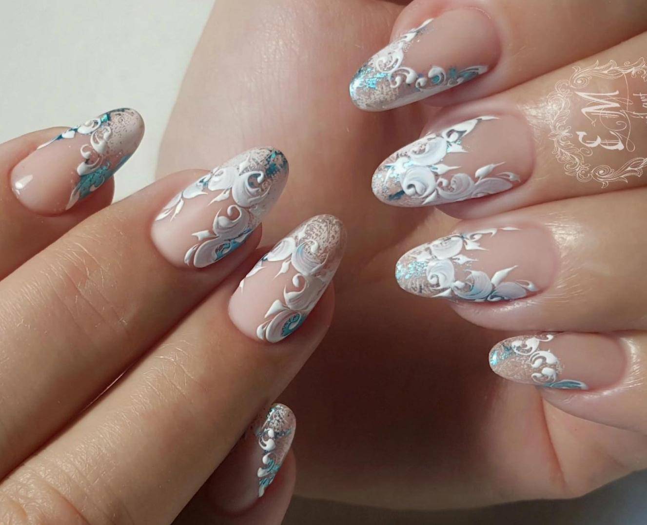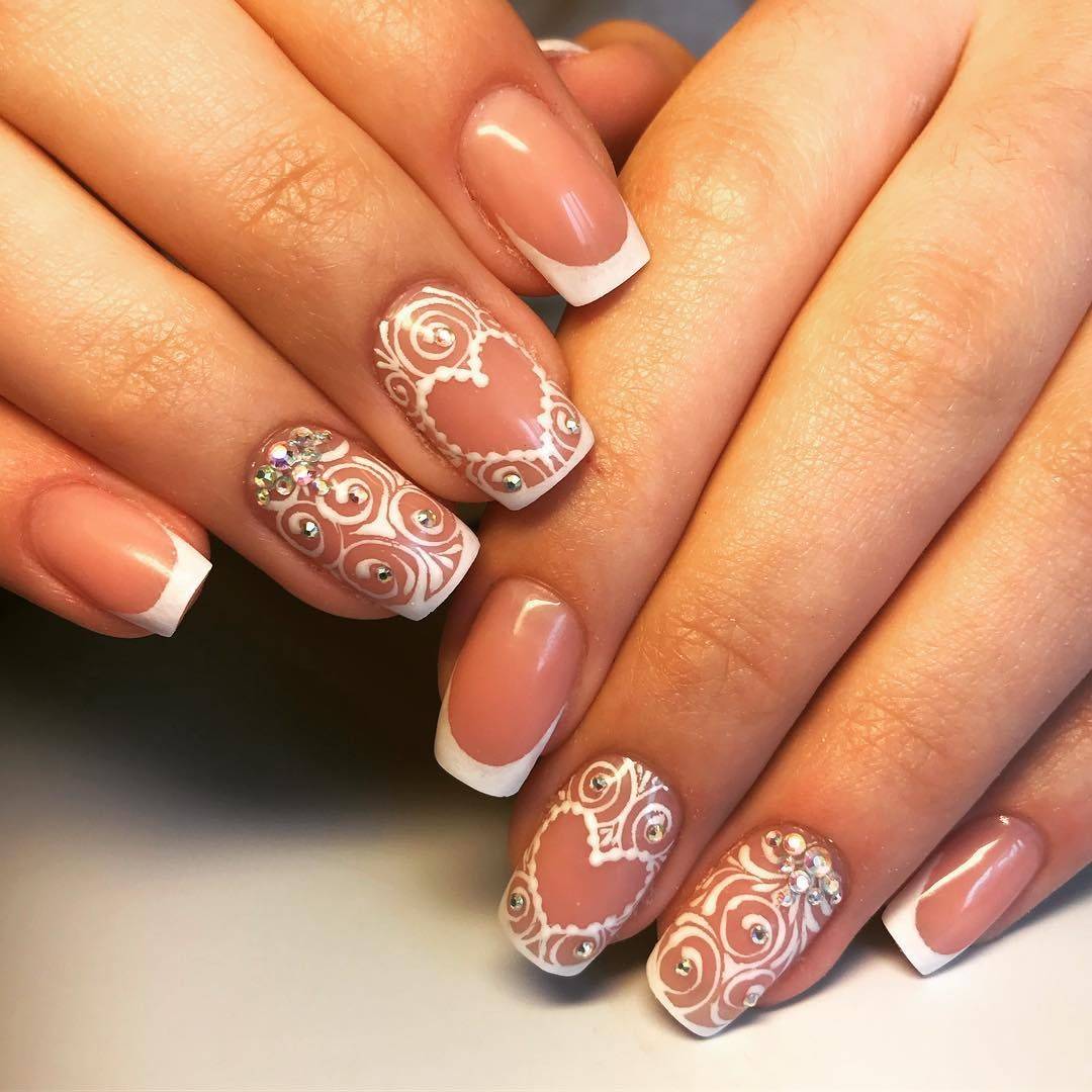 Свадебный дизайн ногтей «Кружева» готов. Можно заменить основные цвета рисунков на ногтях на другие, например, сиреневый или розовый, тогда этот декор ногтей будет уместен на любом мероприятии. К плюсам такого рисунка на ногтях можно отнести его способность визуально удлинять ногти благодаря диагональной линии.