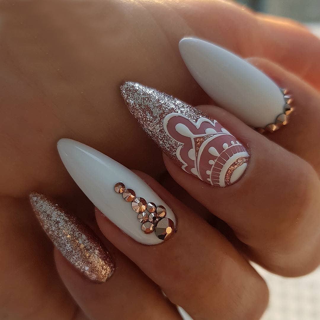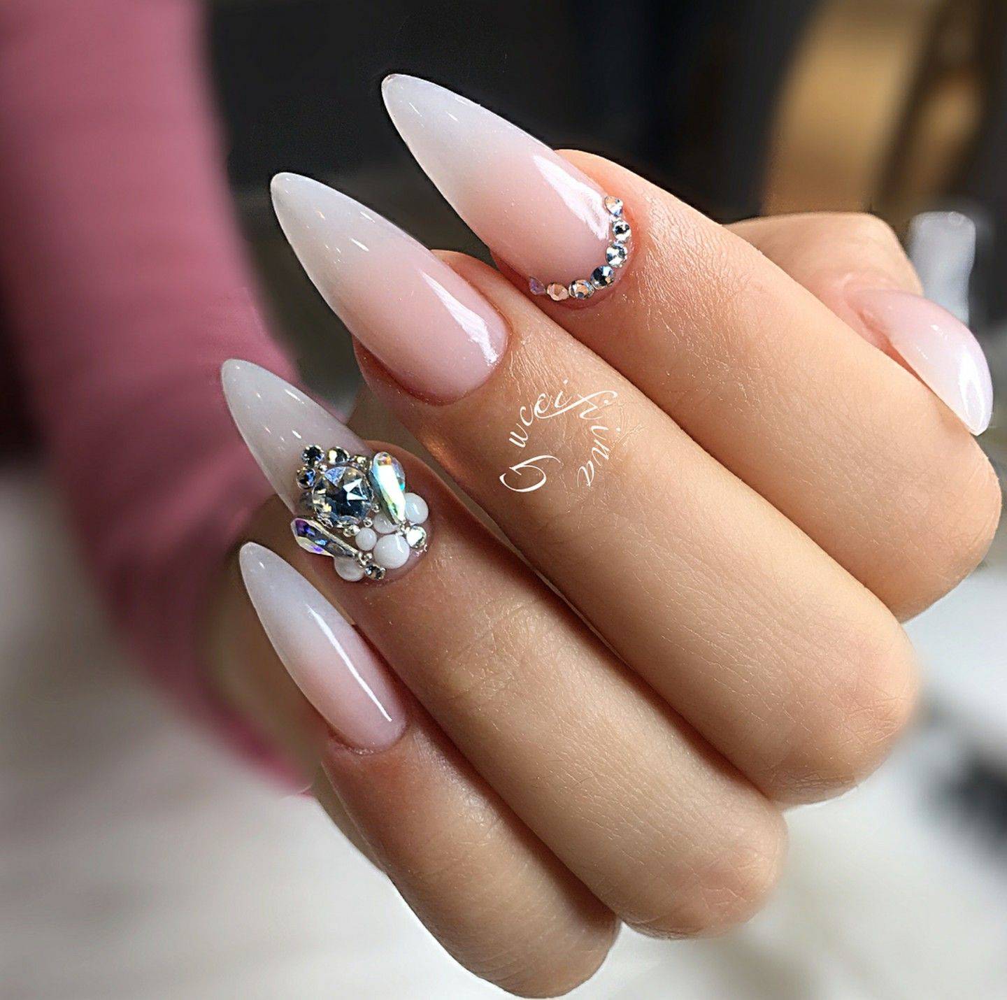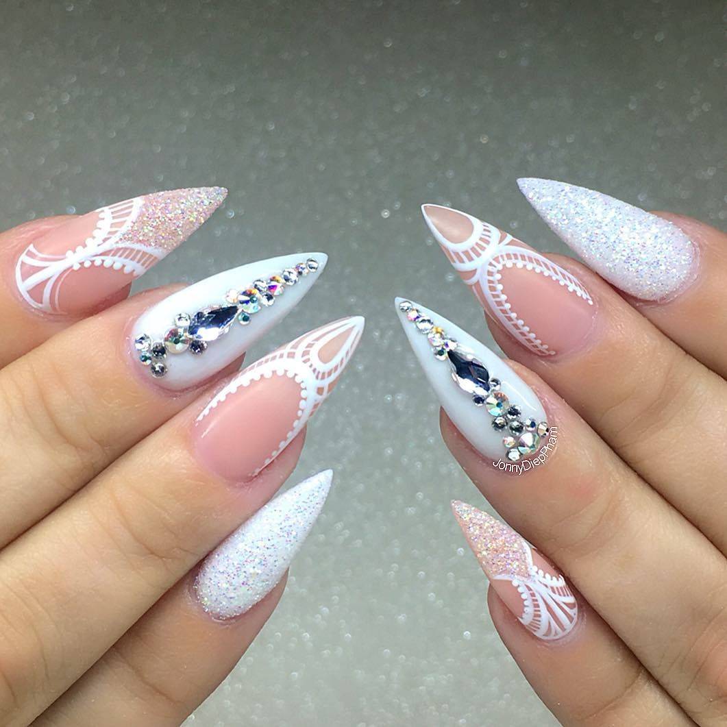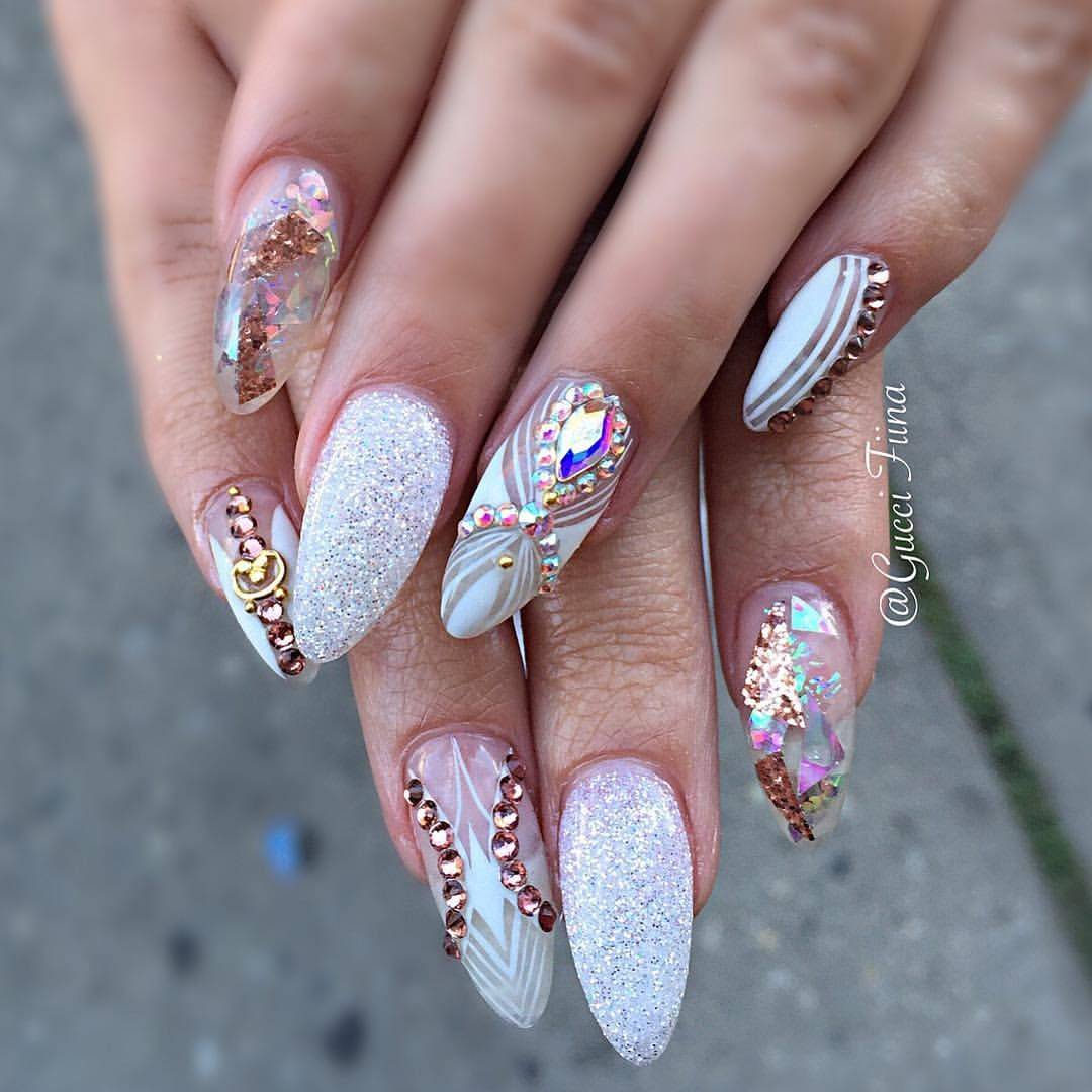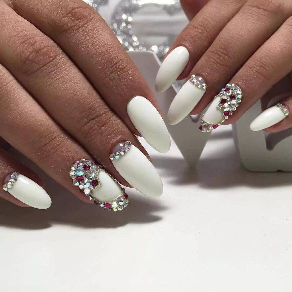 - кристаллы Сваровски – легендарные камни, которые представлены в разных цветовых решениях. Кристаллы Сваровски отличаются от обычных стразов непередаваемым сиянием и свечением, которое безумно красиво смотрится на ногтях невест. Инкрустация из стразов Сваровски удивительно красиво выглядит на миндальных и квадратных ногтях.