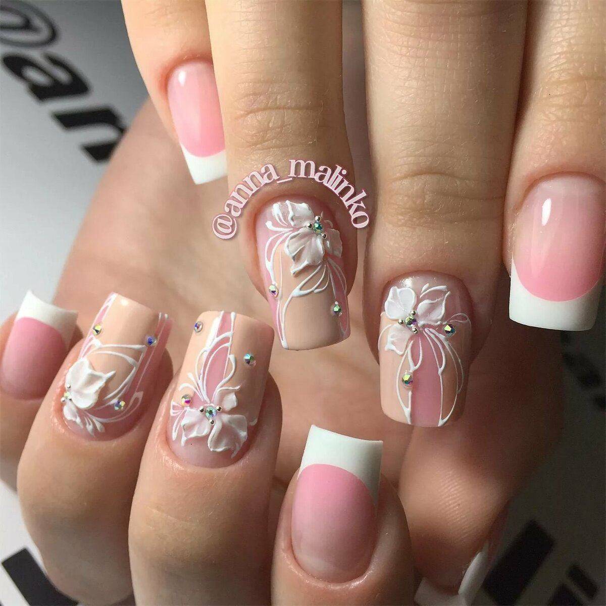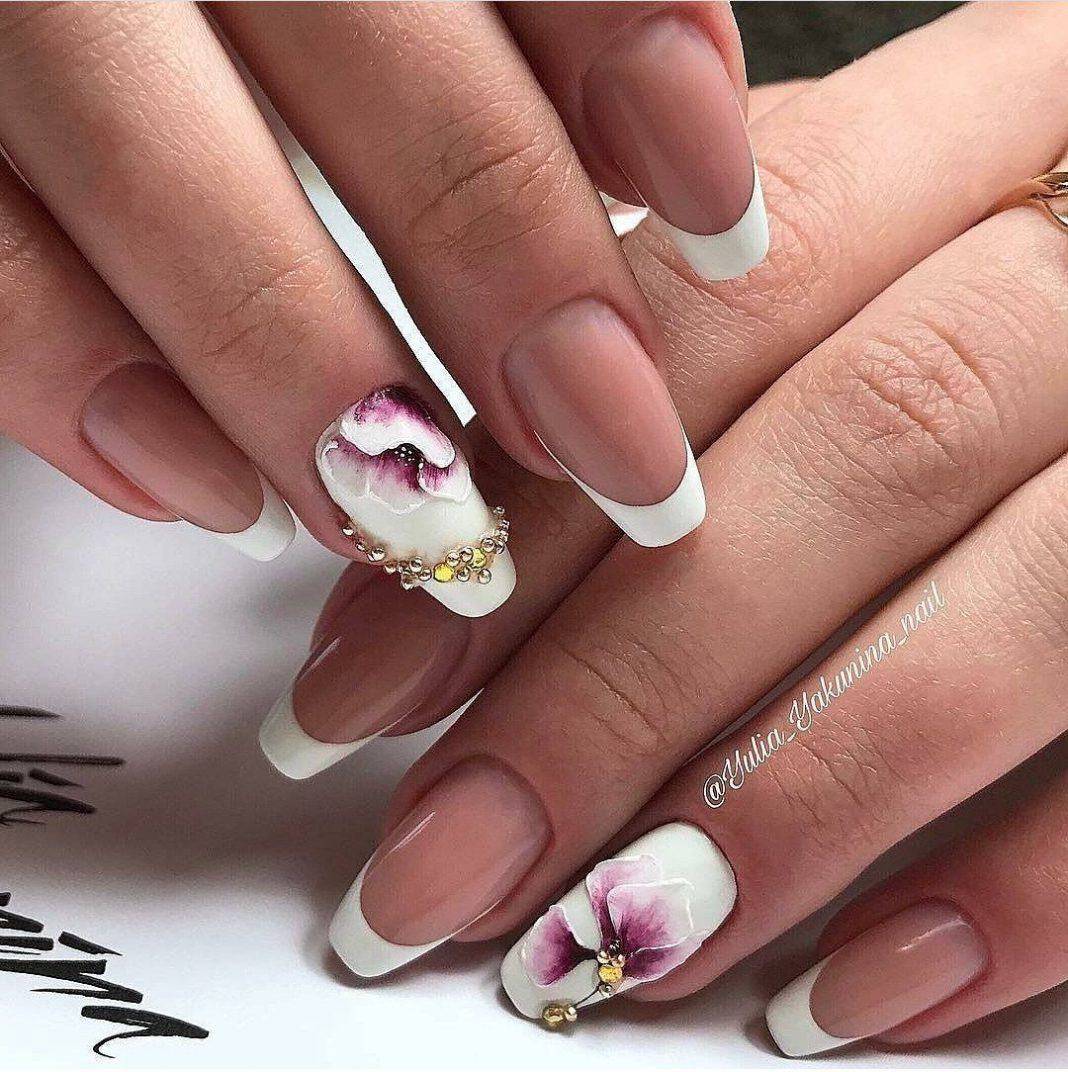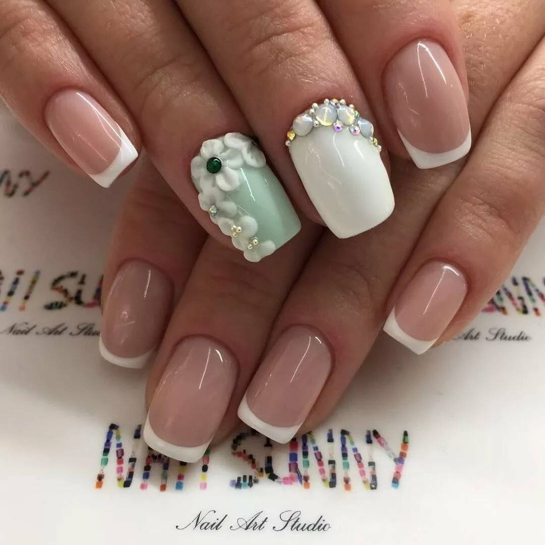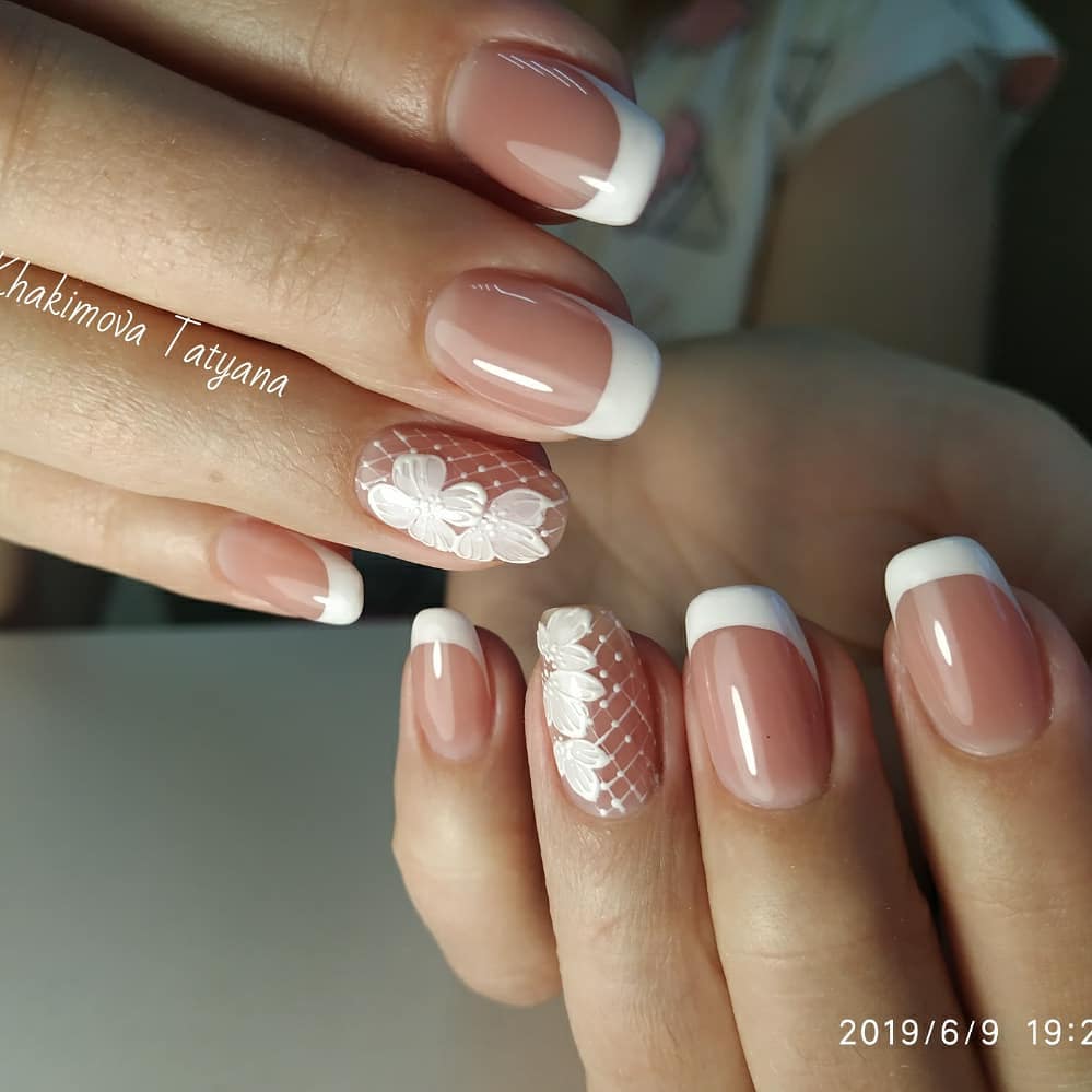 Главное правило здесь – это белая полоска по краю отросшего ногтя (ее можно делать от руки или по трафарету). А вот основу можно выбрать из нюдовых цветов или оставить просто прозрачную базу. Очень красиво и шикарно смотрятся и пользуются популярностью в 2020 году цветы из пластики и малые бусины из бульонок. Лак рекомендуется использовать глянцевый, а также гелевый (проявляется УФ-лампой).