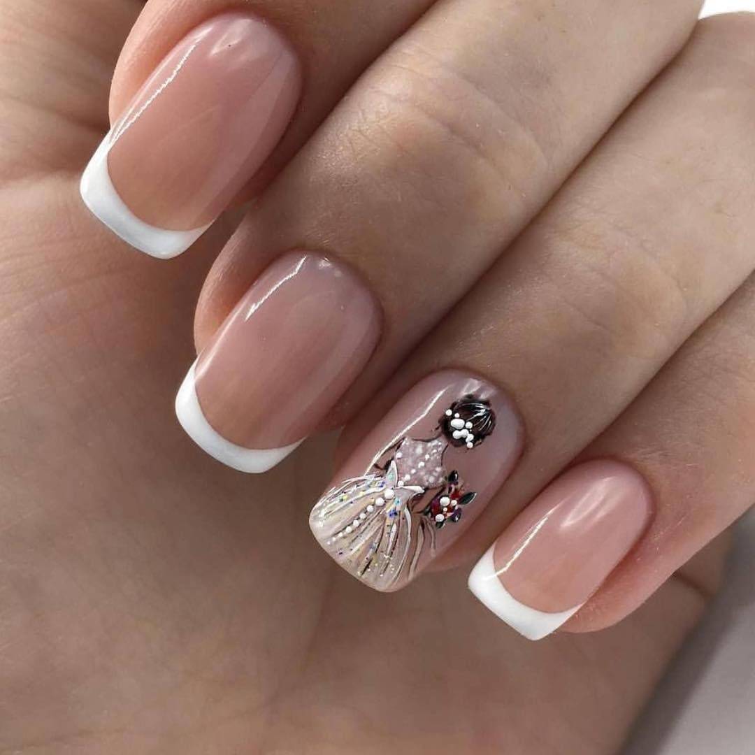 Классический френч может быть и в глянцевом, и в матовом варианте. Такие ногти на свадьбу не будут смотреться неуместно. Кроме этого, френч можно дополнить рисунками и инкрустациями. Особенно хорошо будут смотреться стразы от «Сваровски».