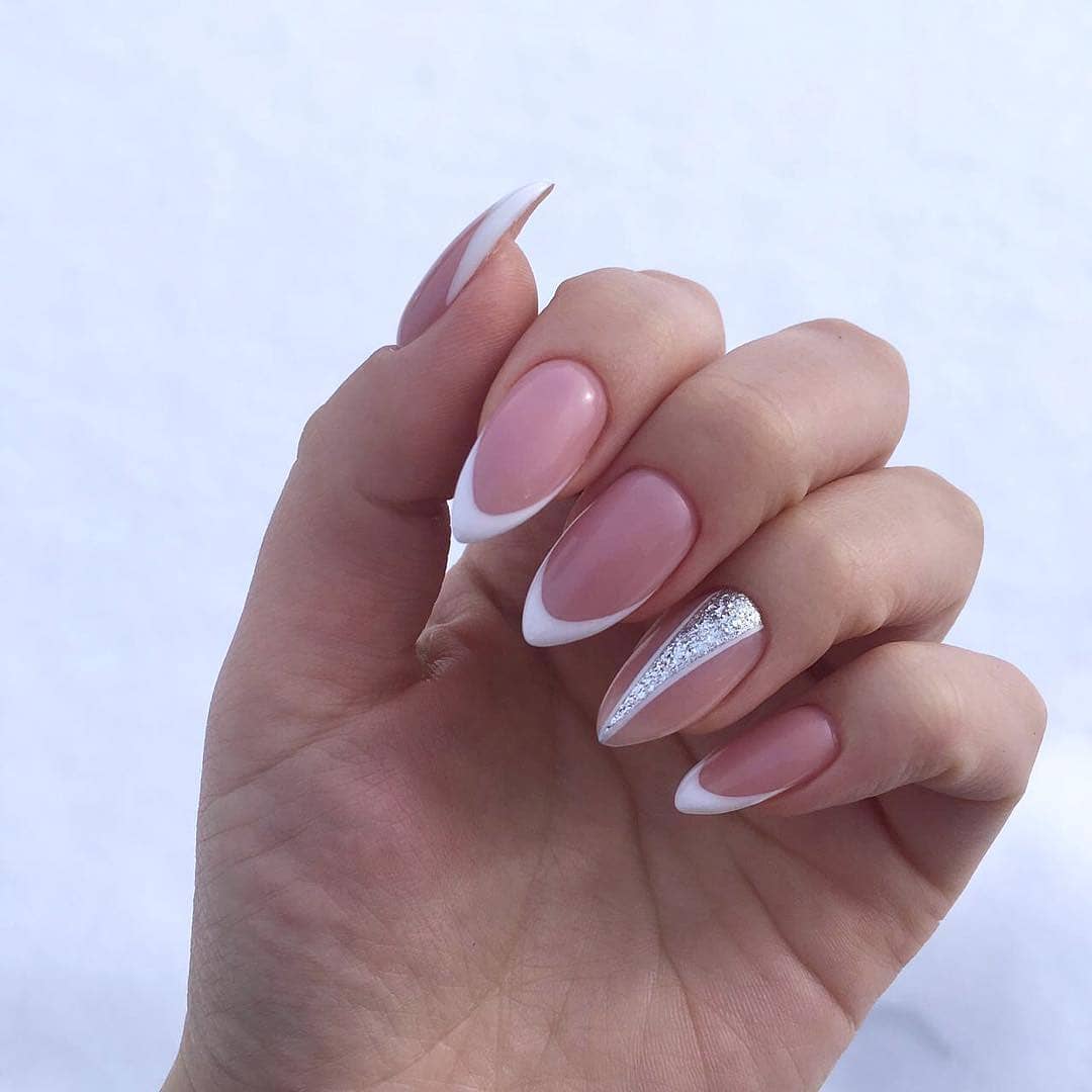 Самым оптимальным вариантом под любую одежду и для любого стиля торжества является классический французский маникюр. Он предполагает покрытие свободного края ногтя белым цветом аккуратной ровной линией в форме полукруга. Остальная часть ногтя остается прозрачной, или ее покрывают цветом ногтевой пластины – телесным, светло-розовым и так далее.