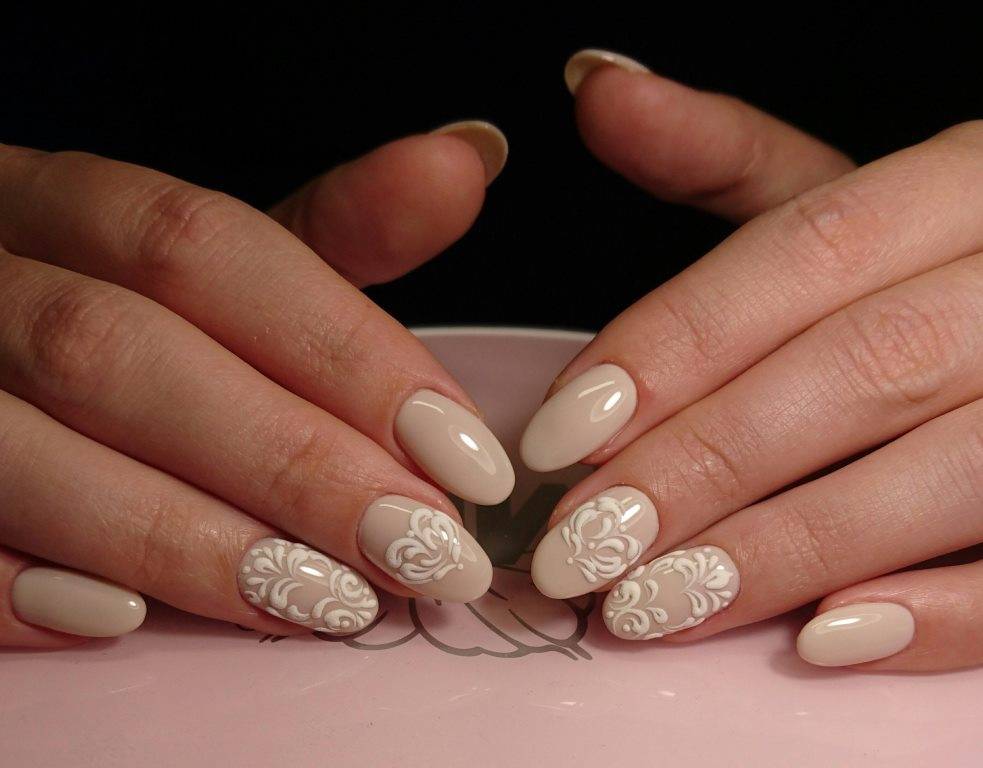 Монотонный дизайн также хорошо сочетается с кружевом. Особенно великолепно будет смотреться белое кружево на ноготках светлого бежевого цвета.