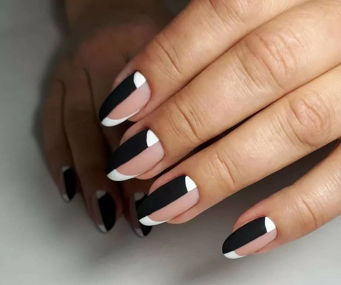 Необычный дизайн получается при сочетании лунного маникюра с белым френчем, при котором ногти вертикально поделены пополам. Одна половина ногтя окрашивается черным лаком, а вторая оставляется непокрытой в стиле negative space.