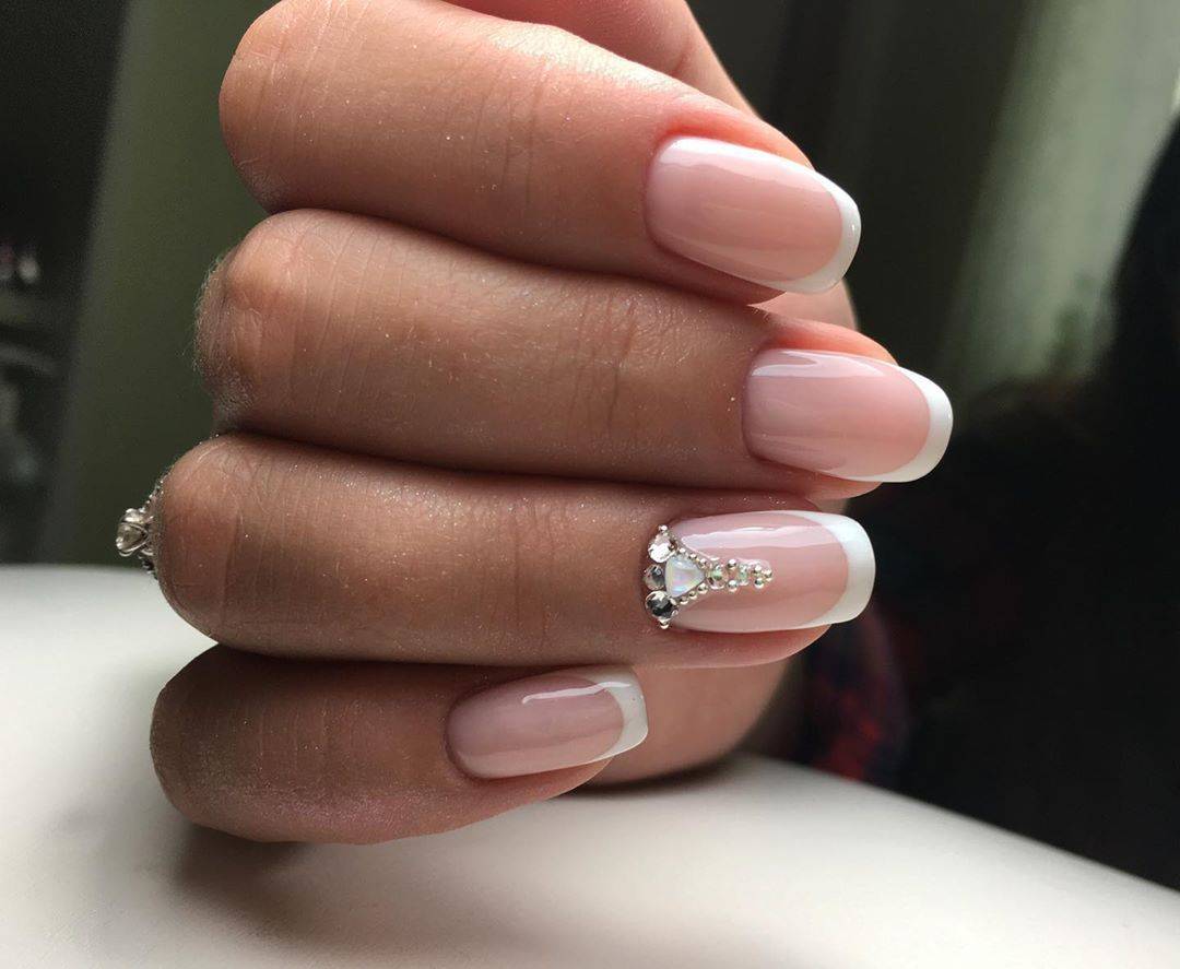 Но у нас ведь свадьба. И чересчур скромничать мы будем после нее, а не сейчас. Поэтому к однотонным ноготкам смело добавляем стразы. Их можно выложить в виде полоски по контуру подушечки. Получится, что мы отделили френч, но он того же цвета, что и основной ноготь. Как вариант – френч из стразиков. Кстати, френч можно выложить не только стразами, но и блестками или фольгой.