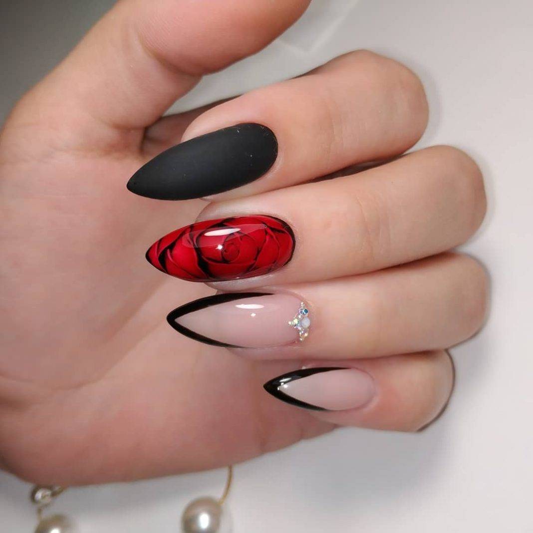 Классический черный цвет эффектно выделяет форму ногтя и делает дизайн броским и ярким. Такой дизайн будет еще интереснее, если один или два ногтя выделить тонким кружевом, глиттером или закрасить полностью яркими тонами.