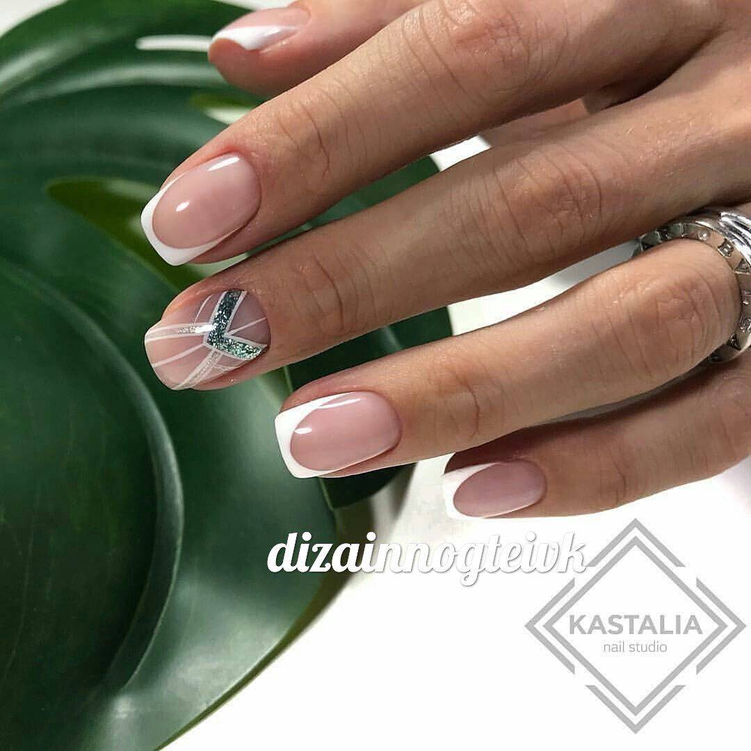Главное правило здесь – это белая полоска по краю отросшего ногтя (ее можно делать от руки или по трафарету). А вот основу можно выбрать из нюдовых цветов или оставить просто прозрачную базу. Очень красиво и шикарно смотрятся и пользуются популярностью в 2019 году цветы из пластики и малые бусины из бульонок. Лак рекомендуется использовать глянцевый, а также гелевый (проявляется УФ-лампой).