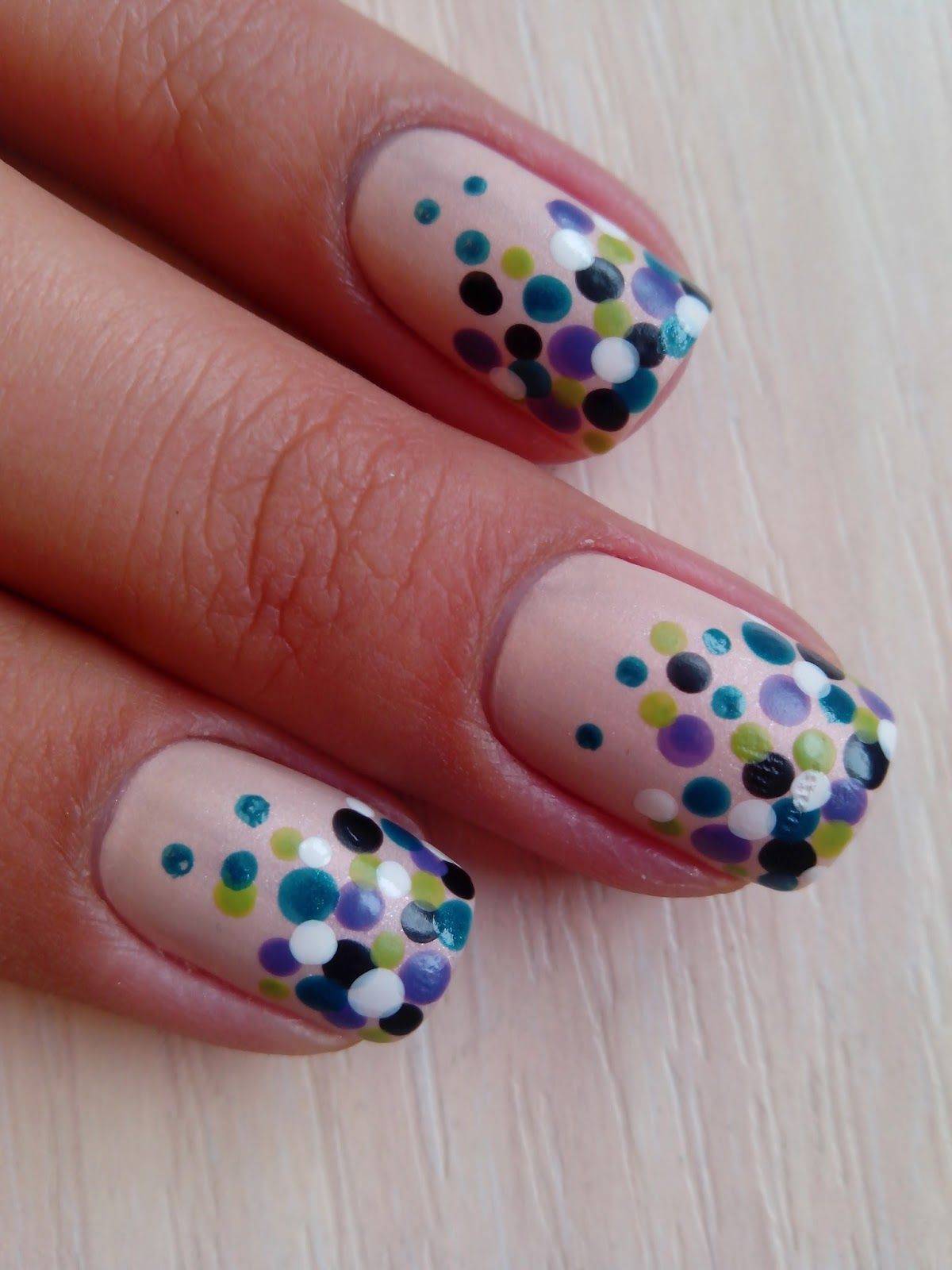 - «Горошек». После нанесения основного цветного слоя на ногти можно добавить «горошка» поверх него. Для этого мастера используют дотс, который имеет разного размера наконечники. Но в домашних условиях можно воспользоваться шариковой ручкой, зубочисткой, спичкой, невидимкой, палочкой для ушей, крючком, портновской булавкой. Главное выбрать подходящий размер «горошка». Такой дизайн можно исполнить на нескольких ногтях, а можно — на всех сразу. «Горошек» может быть, как одного размера, так и разного. Этот дизайн наиболее гармонично будет смотреться на овальных ногтях.