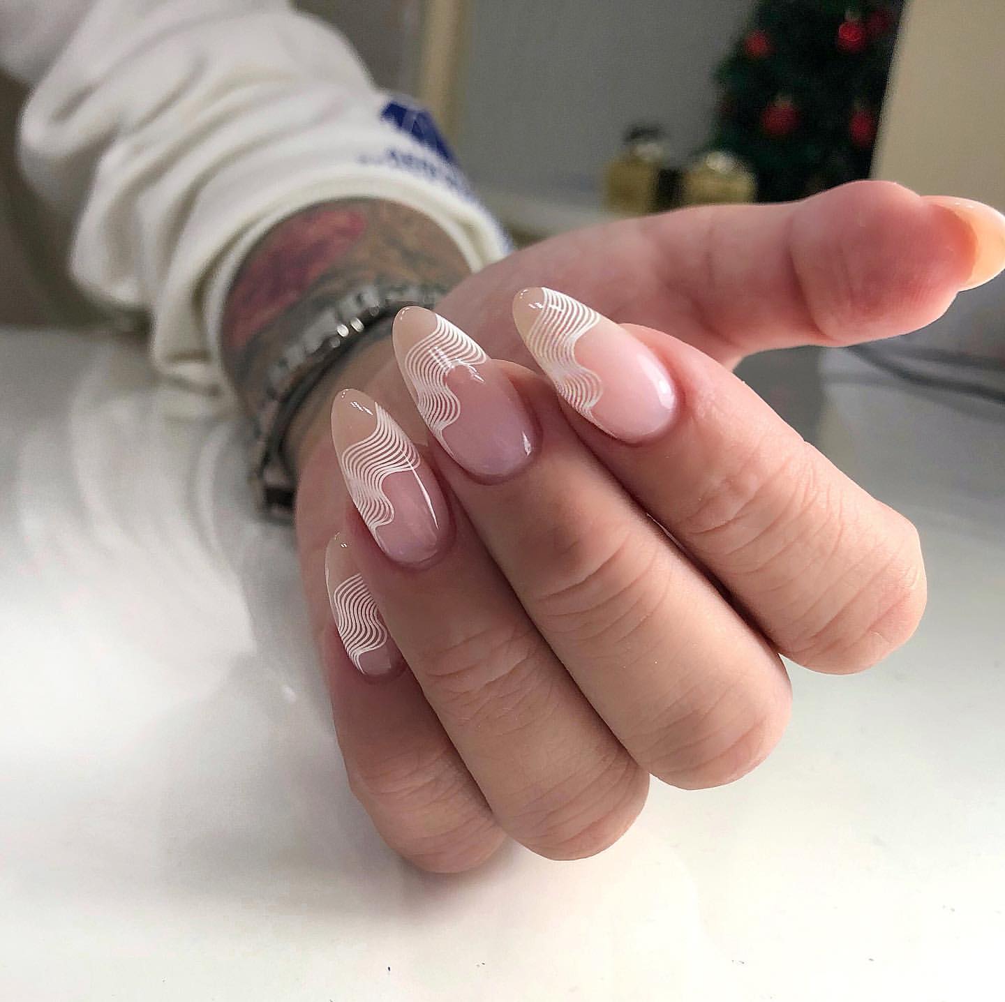 Молочный оттенок гель-лака с еле заметным рисунком смотрится просто великолепно.