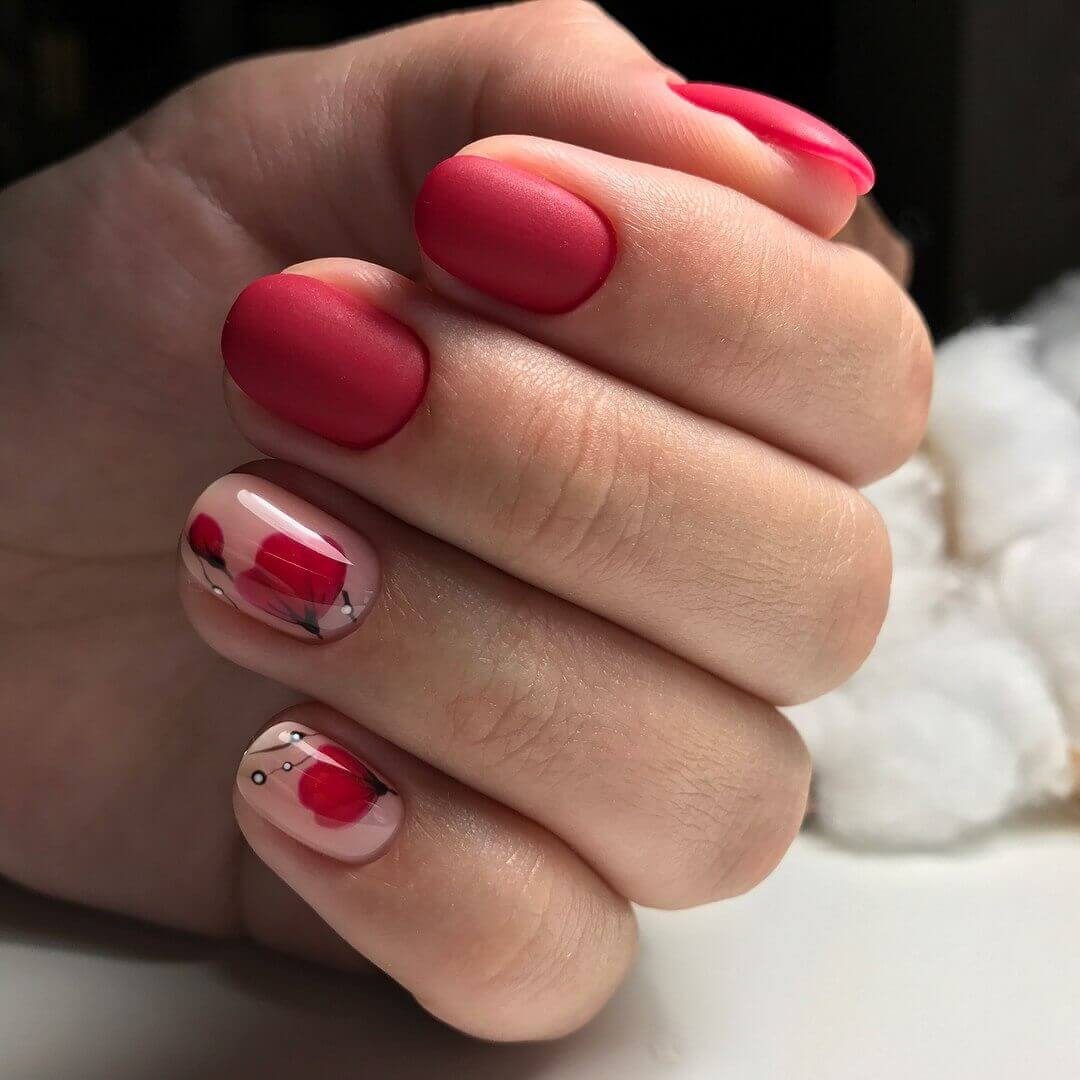 Красный маникюр гель-лаком может сочетаться с разными техниками в дизайне, для выполнения которых не нужны профессиональные инструменты. Это – горошек, лунки, геометрические линии, френч, цветы и вензеля (фотографии представлены ниже).