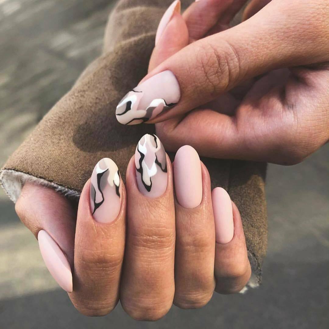 Еще одно стильное исполнение – нанесение разноцветной фольги на камуфляжное покрытие в виде хаотичных мазков. Такой дизайн делайте на 1-2 пальца, остальные окрасьте в яркий цвет.