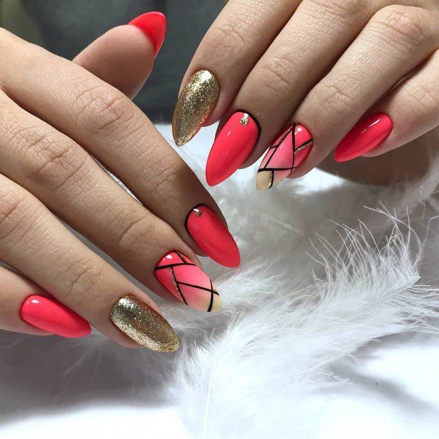 - Геометрия в маникюре. Геометрические линии можно нарисовать кистью или использовать трафареты. Тут трафареты можно заменить даже скотчем. Главное, чтобы линии были исполнены ровно и тогда прорисуется четкая геометрия на ногтях. Красиво будут смотреться прозрачные треугольники у основания ногтя или обычные бесцветные полосы в сочетании с красным цветом. Конечно можно сочетать и другие цвета, но лучше не комбинировать больше трех оттенков.