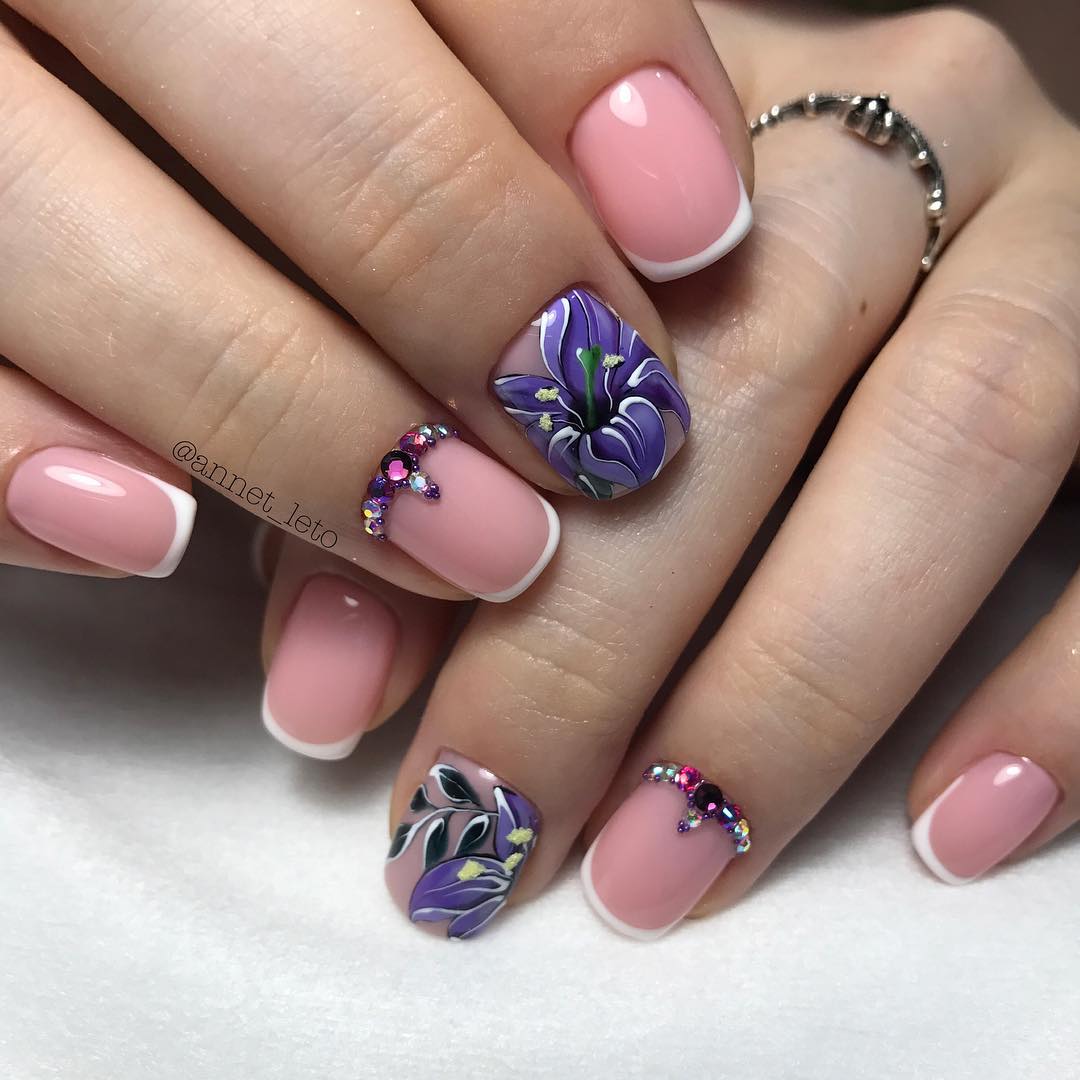 Вы можете выполнить френч на прозрачном покрытии, выделив при этом улыбку фиалковым, сиреневым или лавандовым цветом, а можете один из предложенных либо других оттенков из данной палитры использовать в качестве основы, нарисовав улыбку классическим белым цветом. Красиво смотрится такая длина с аккуратными рисунками, минимальным декором в виде страз, бусин и глиттера, которыми украшается улыбка или выделяется акцентный пальчик. Главное не перегрузить ноготки, чтобы пальчики не выглядели массивно.