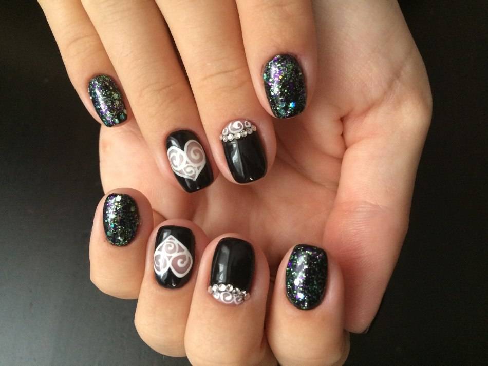 Сердце изображенное глиттером может быть маленьким, с контуром, без контура. Кстати, чтобы выделить его и сделать более необычным контур прорисовывают черным или белым гель-лаком.