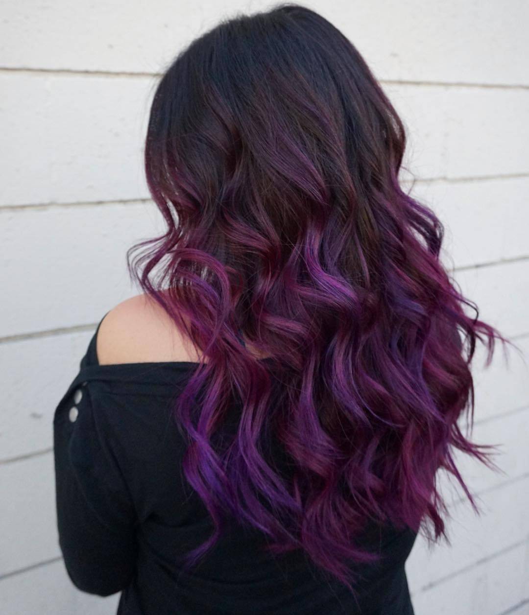 Если волосы сами по себе темные, красно-фиолетовый вариант подчеркнет их объем и глубину цвета. Как правило, делается постепенный переход от темных корней с красным кончикам через фиолетовый тон.