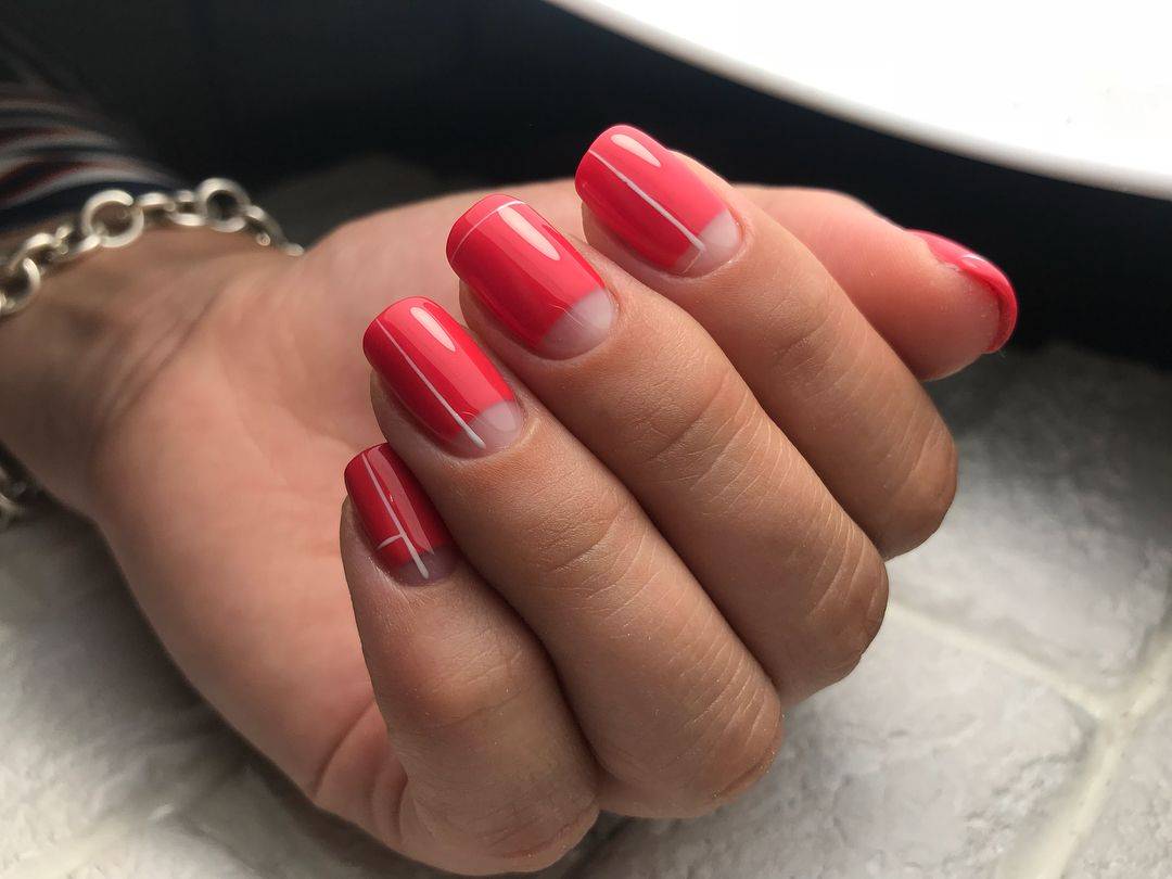 Обратите внимание на такие оттенки, как светло-красный, алый, ярко-красный или бордовый, которые стоит украсить тонкими линиями черного цвета. Достаточно эффектно и популярно наносить лунный маникюр с алым или бордовым лаком, на котором выполняют белые, черные или бежевые полосы в геометрическом стиле