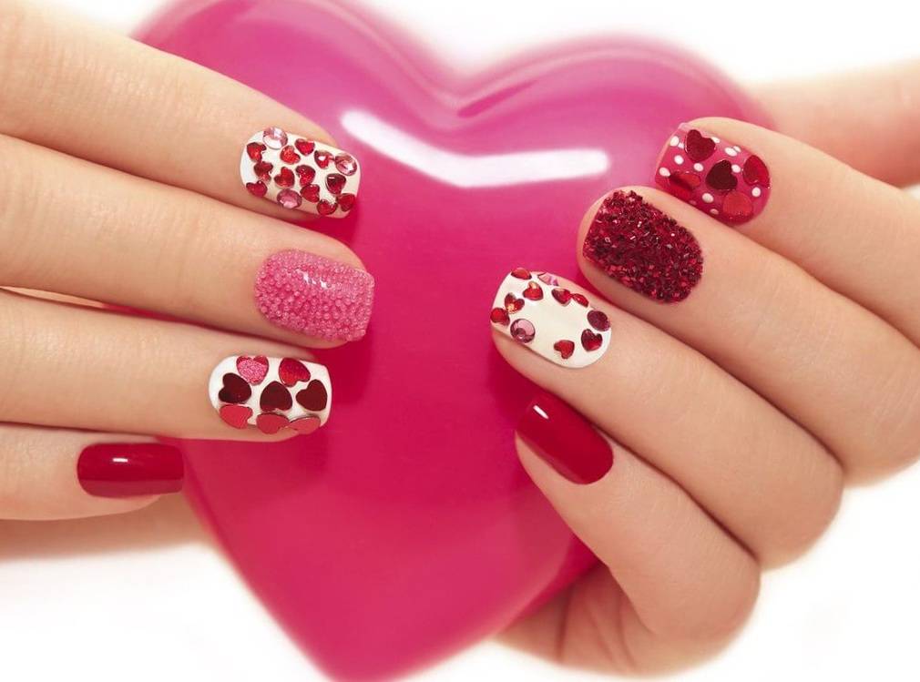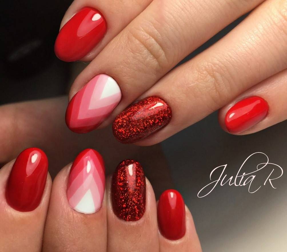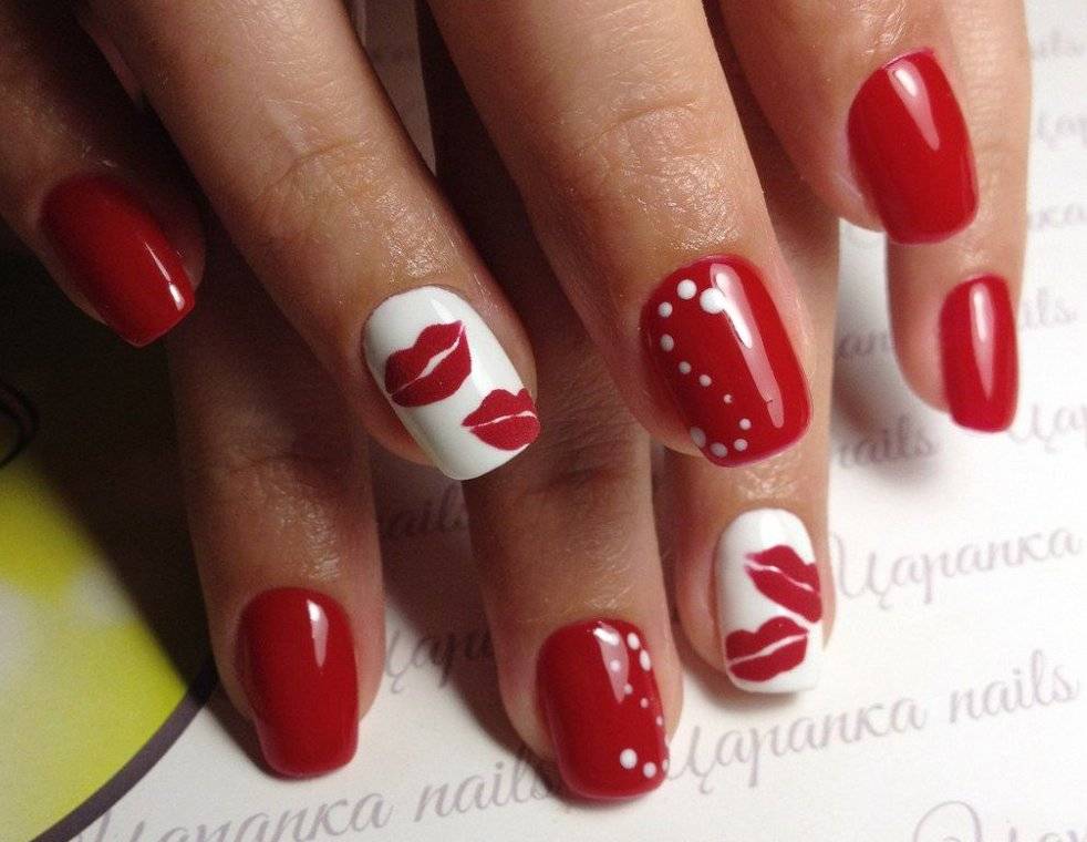 • лунный плюс френч – отлично смотрится в качестве повседневного лёгкого покрытия сочетание красно-белого френча и обратного французского маникюра: белые лунулы и улыбки француза на фоне красного основного тона или наоборот – красные улыбки на фоне белой базы смотрятся элегантно и эстетично;• дизайн с рисунком – очень тонким и выразительным ногтевым декором считается китайская роспись белыми нитями на красной основе и наоборот: это довольно утончённый вариант, который более уместно смотрится на удлинённой ногтевой пластине;• форменное красное битое стекло на белоснежной основе – довольно интересная версия водружения на ноготки блестящих глянцевых осколков в хаотичной или форменной выкладке; важно при этом нанести фольгу на ногтевые пластины таким образом, чтобы в щелях, трещинах и по ободкам просматривалась белая основа фонового покрытия – так эффект будет ярче и экстравагантнее;• принтованные стилистические стикеры – довольно часто основой праздничного маникюра служат именно красно-белые цвета ногтевого покрытия. Так, в день Святого Валентина отличным выходом служит белоснежный шеллак в качестве основы и красные камифубики или стикеры в виде сердечек в качестве декораций