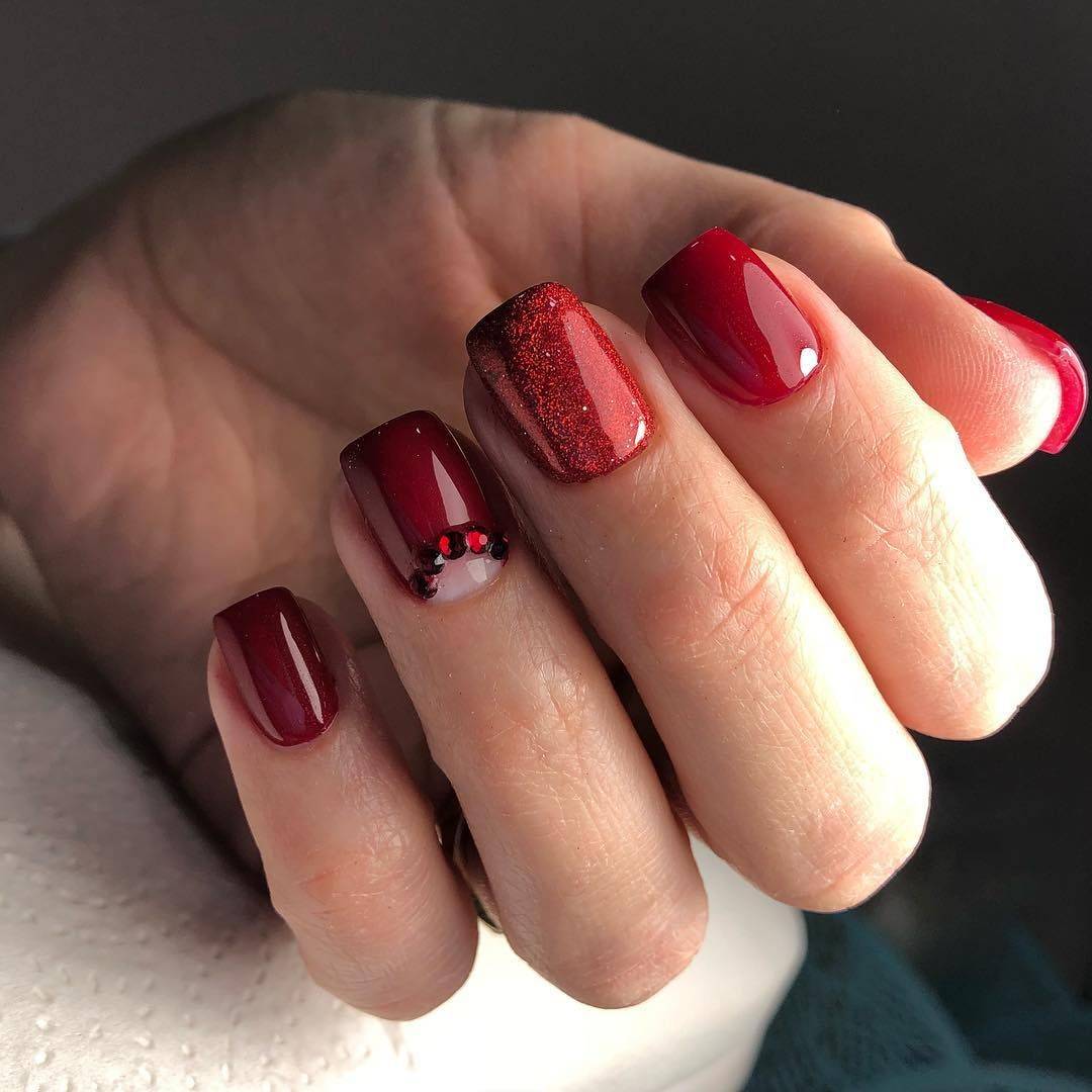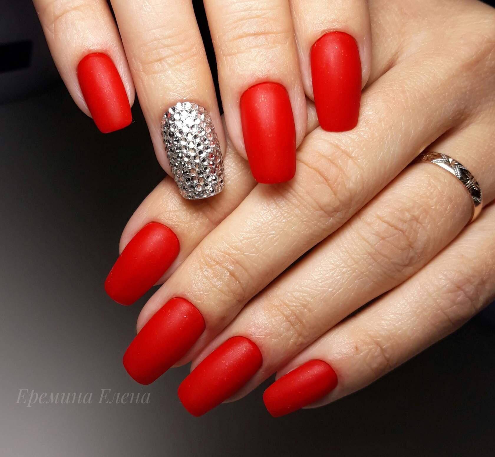 Что касается красного дизайна с втиркой, то в этом году лидирует зеркальная и жемчужная втирка. Они могут быть нанесены как на все, так и только на пару ноготков. Плюс, можно дополнить такой дизайн стразами, градиентом или красивым рисунком.