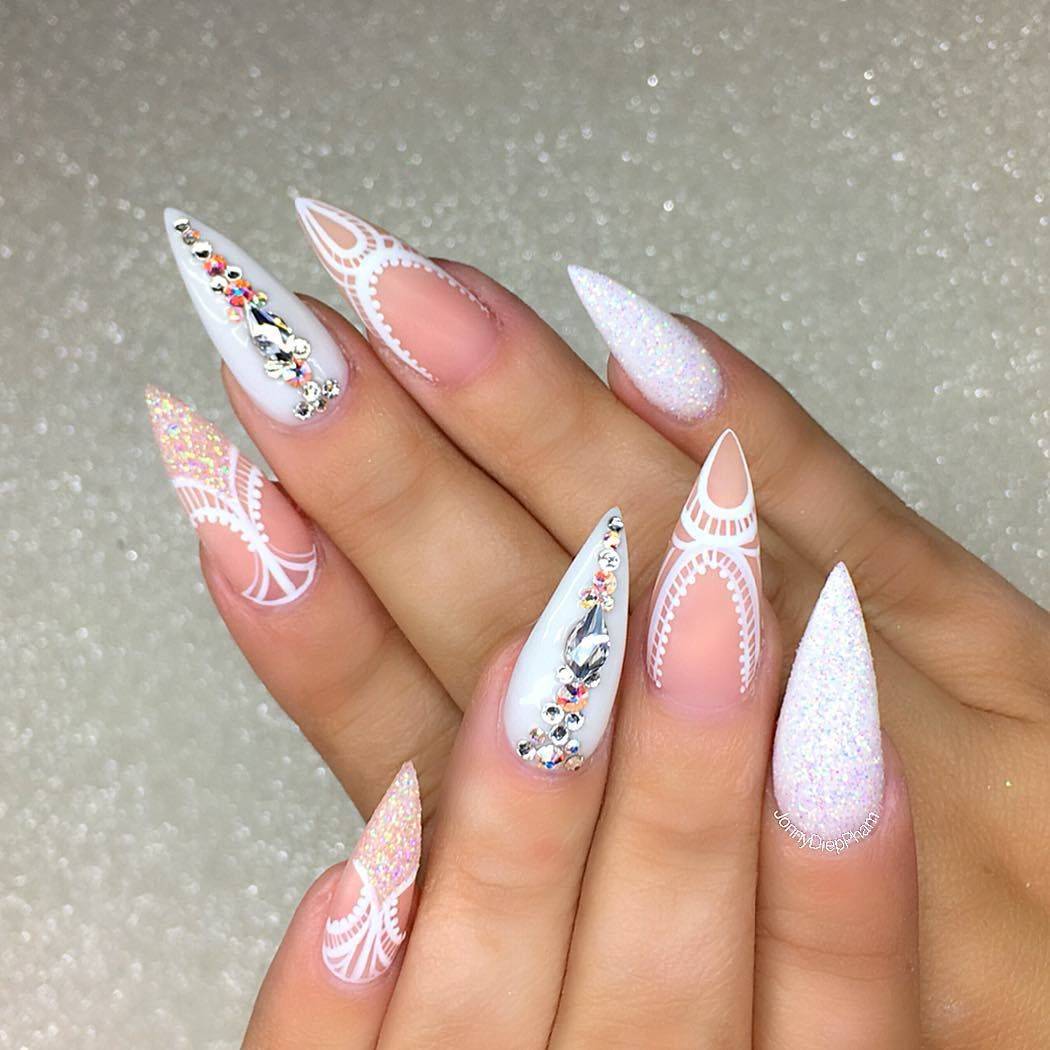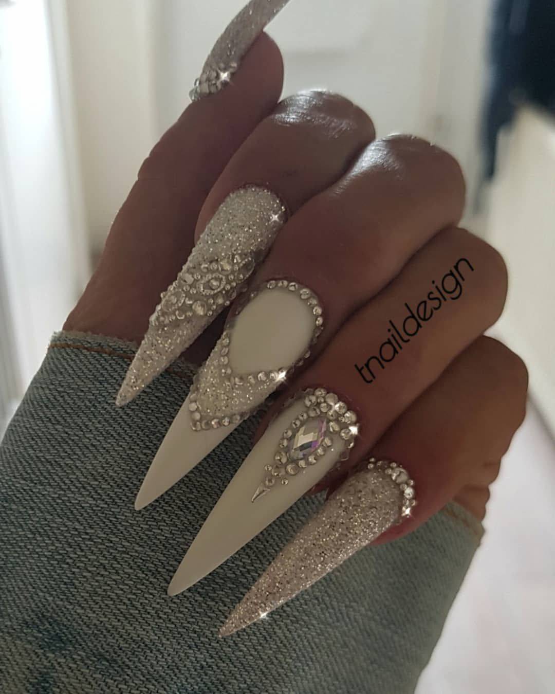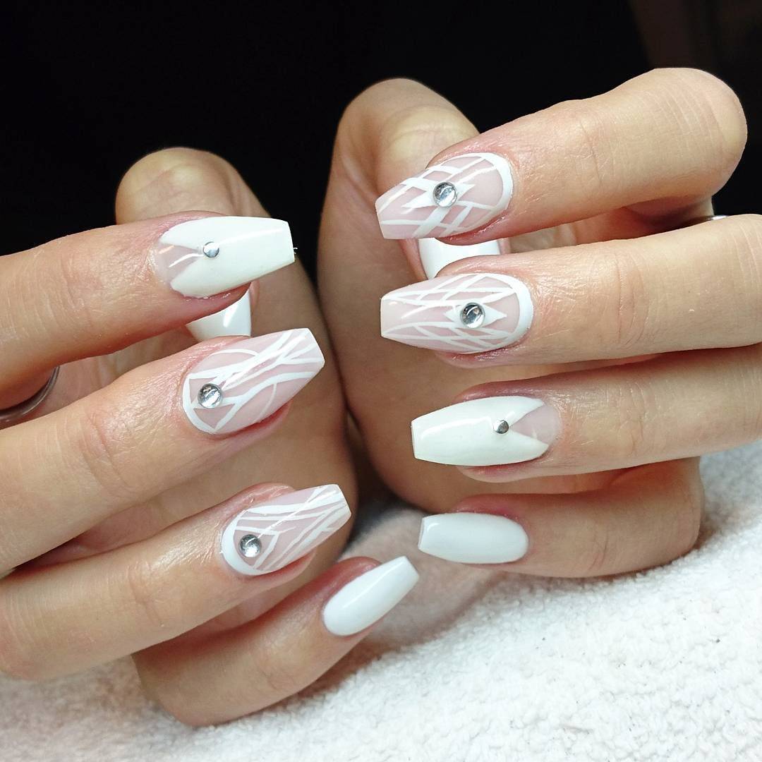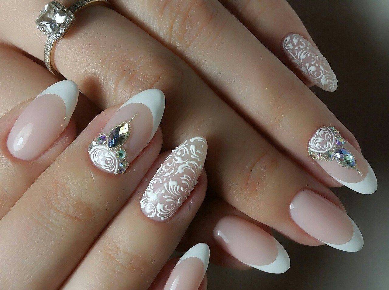 Оформление маникюра на длинных ногтях позволяет располагать на покрытии как минимальное количество декора, та и проявлять фантазию и украшать маникюр более сложными и замысловатыми композициями, если они гармонично впишутся в ваш образ. Длинные ногтевые пластины с белым лаком также не являются исключением. На такой длине можно смело варьировать форму улыбки френча, экспериментировать с узорами и сочетать между собой несколько техник одновременно. Дуэт белого цвета и страз в любом варианте оформления смотрится благородно, утончённо и невероятно красиво.