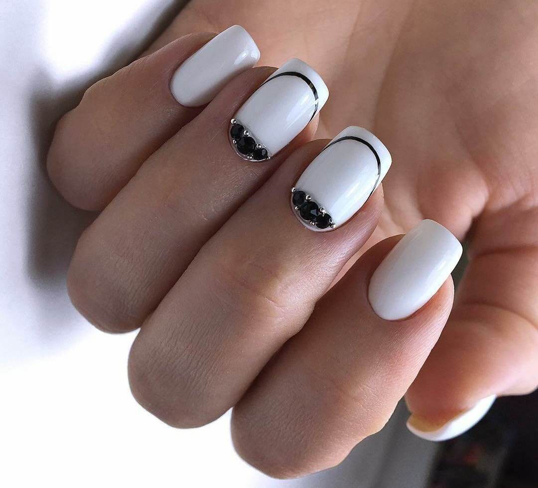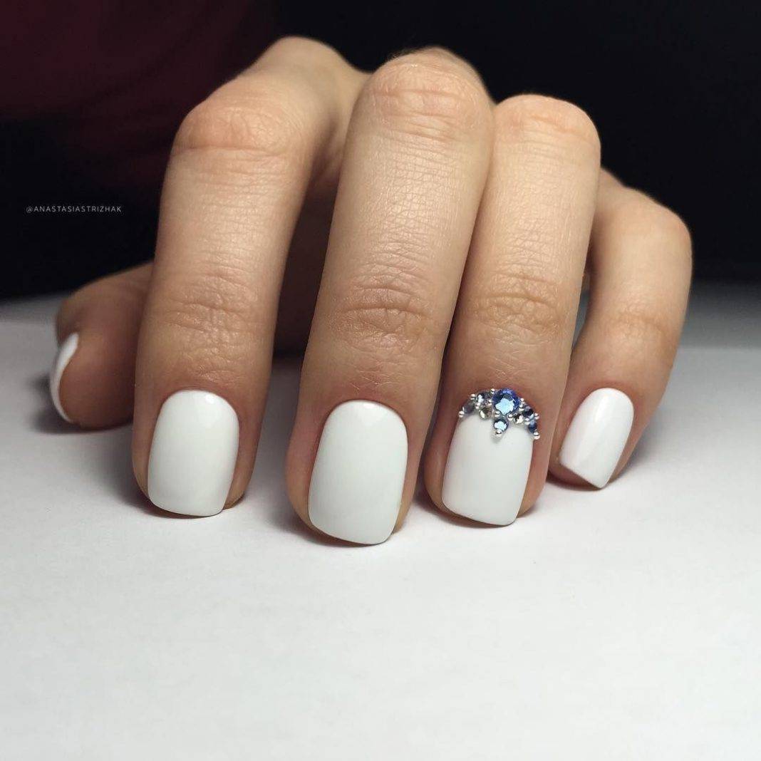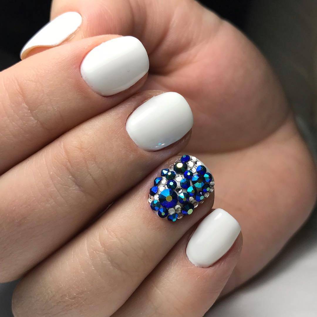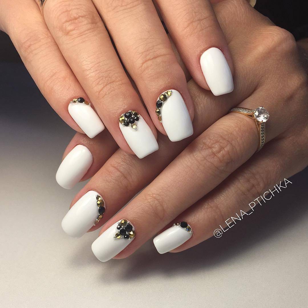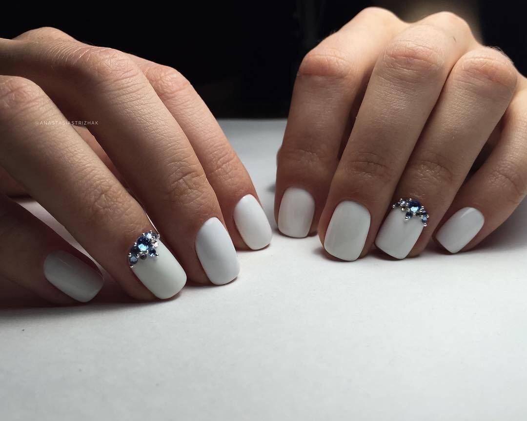 Такой декор, как стразы способен преобразить маникюр и изменить визуальное восприятие любого нейл-дизайна. Наличие всего одного-двух камешков позволит ногтям стать более выразительными и представит свою обладательницу в новом свете. На белом фоне стразы смотрятся особенно нежно и привлекательно. Хотите создать более женственный и романтический образ? Стразы и белый лак станут в этом случае вашей «золотой рыбкой».