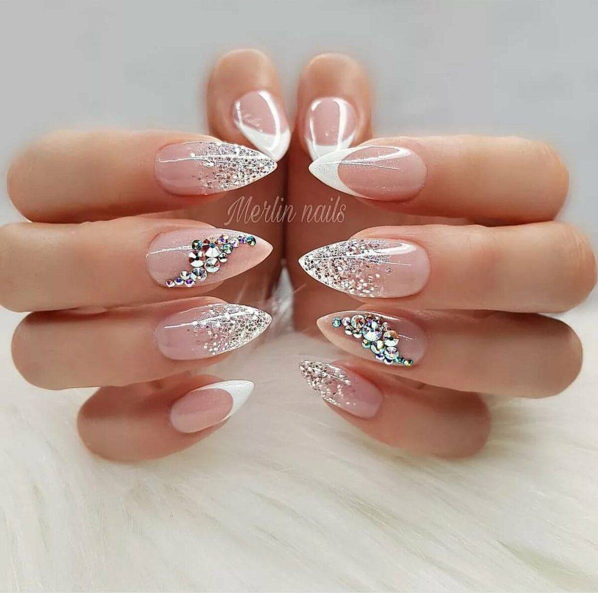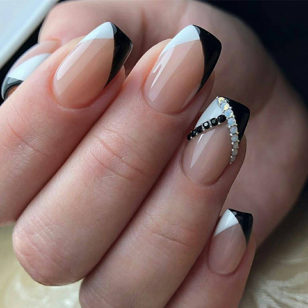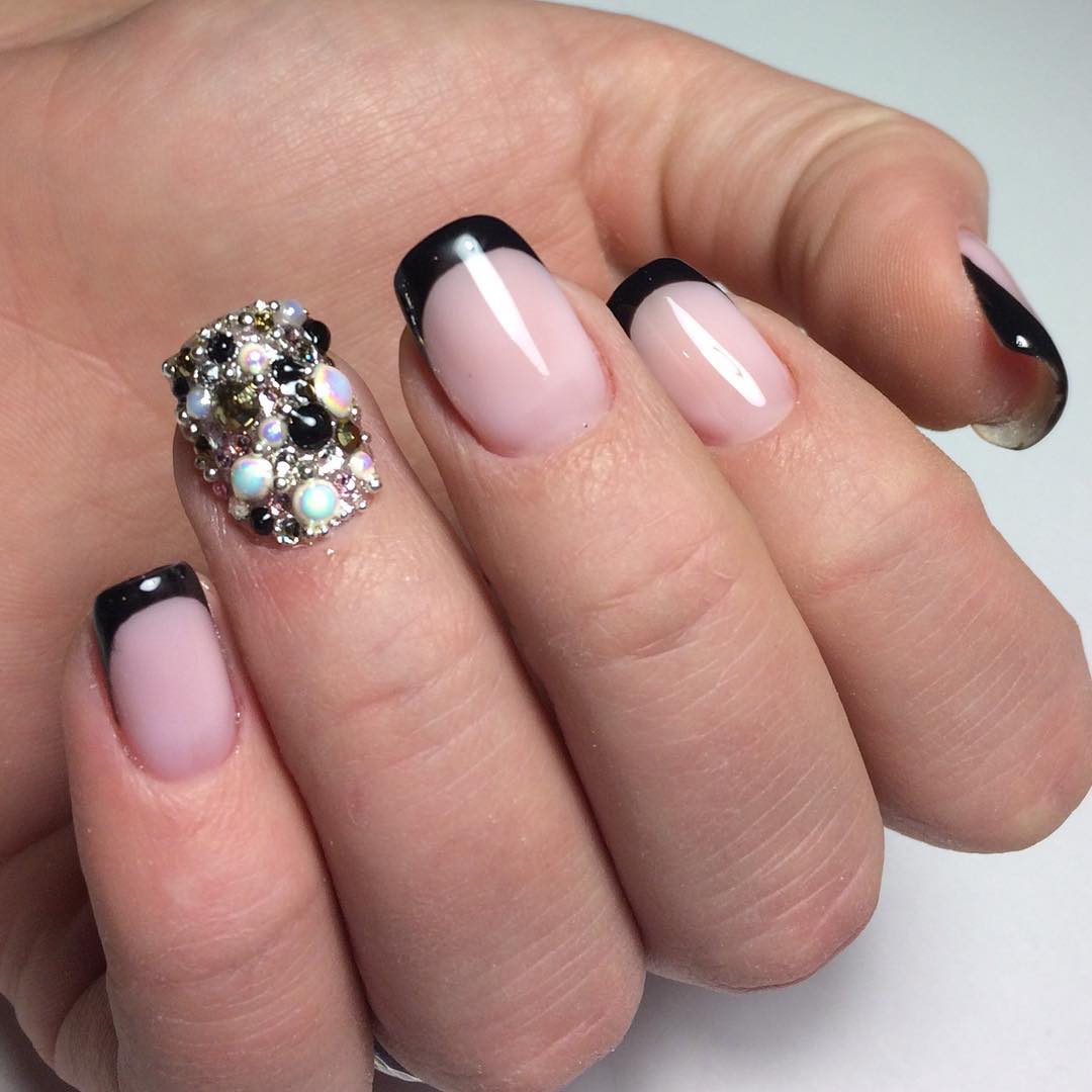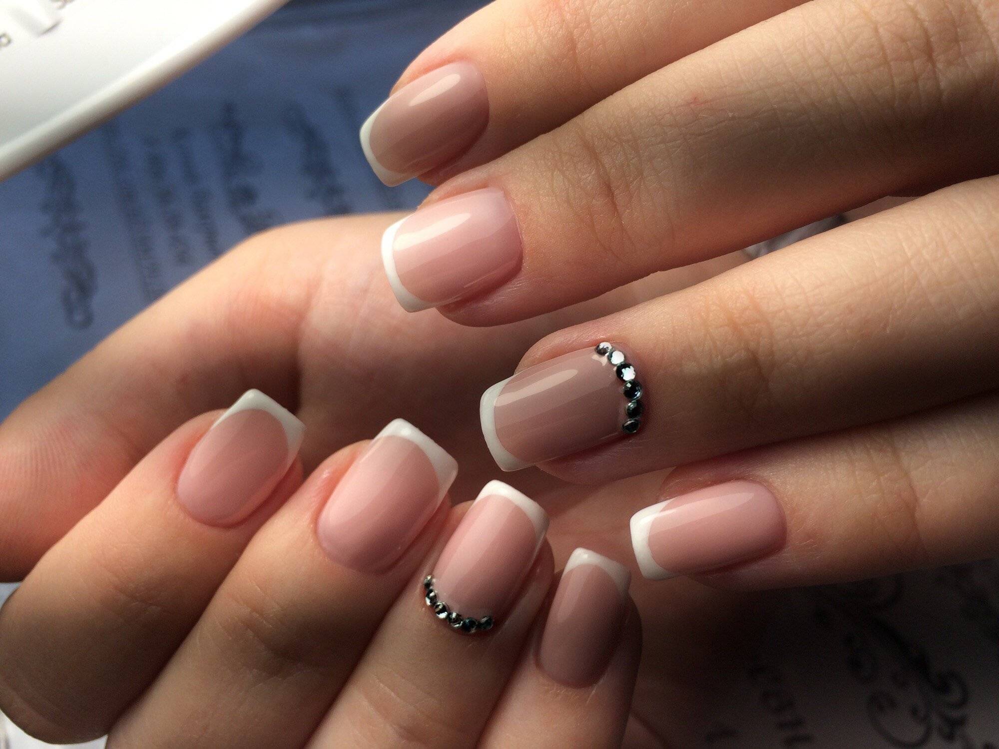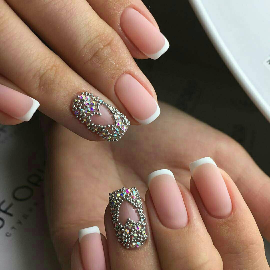 Для французского маникюра нет ограничений относительно длины и формы ногтей. Овальная и треугольная “улыбка” отлично смотрятся на острых длинных ноготках. Френч со стразами может быть выполнен в нескольких техниках:
