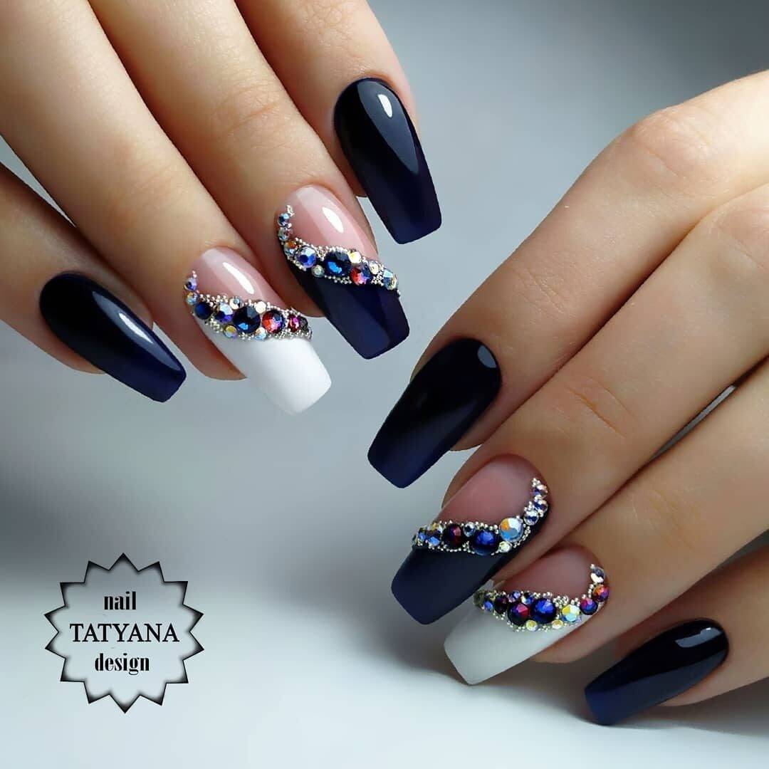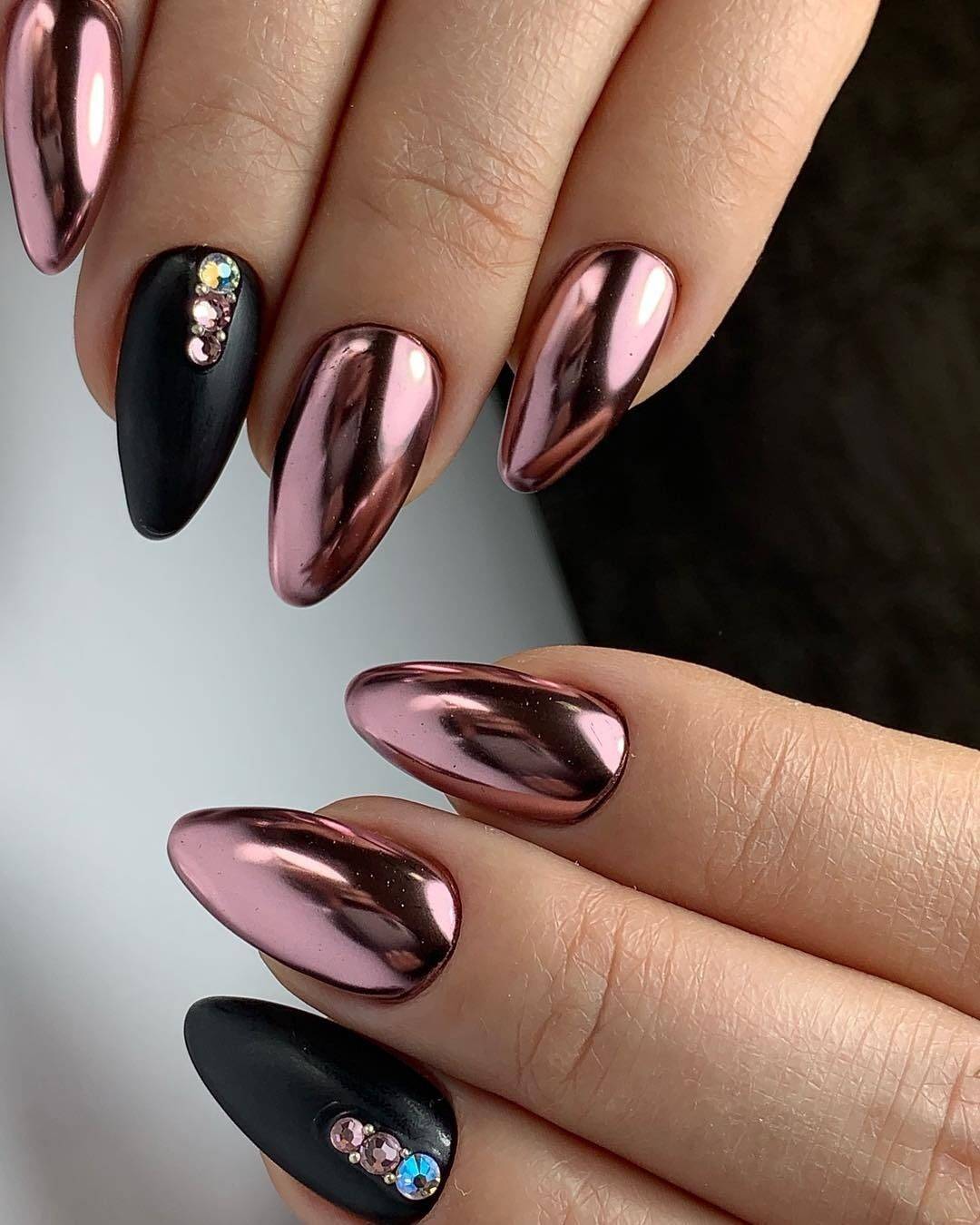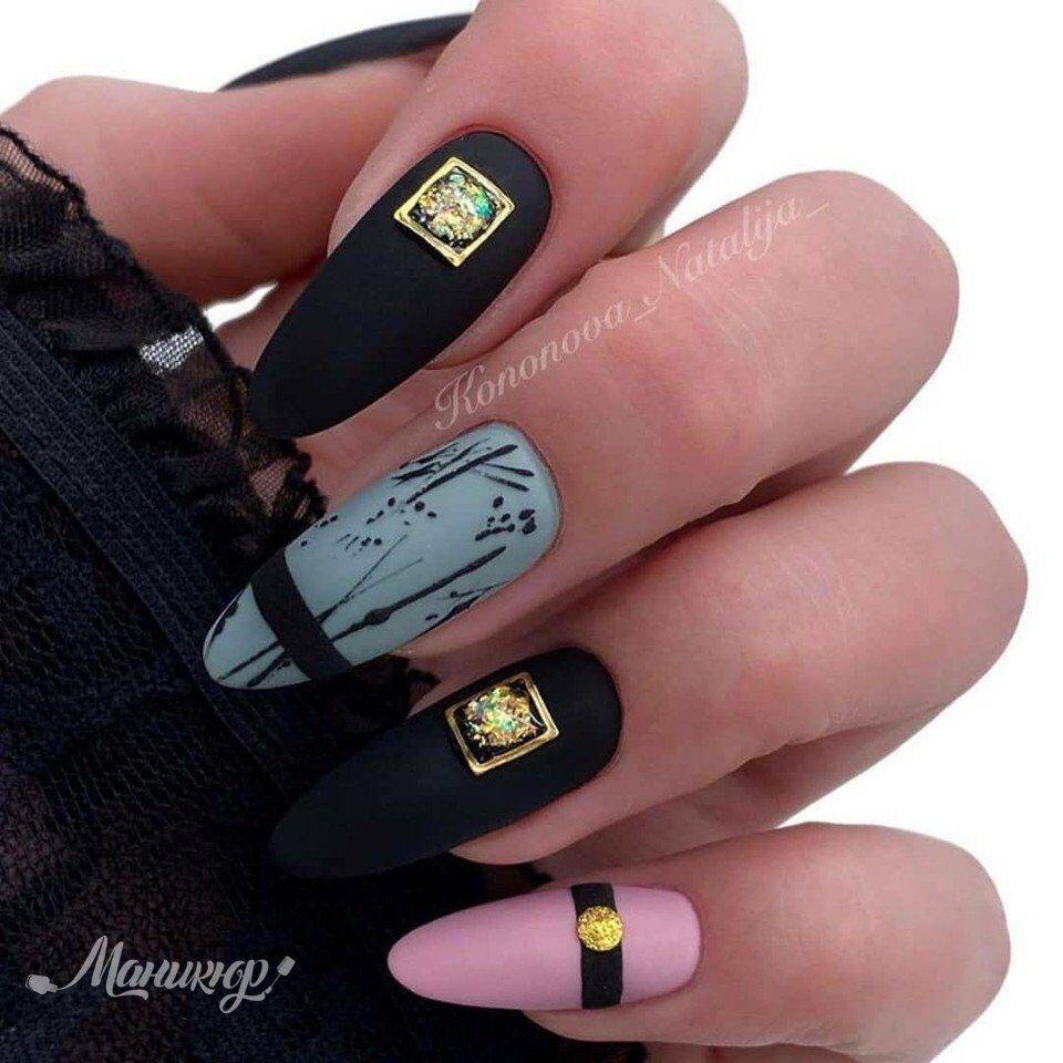 На черном бархатном фоне шикарно смотрятся золотые стразы. Помимо стразов используйте золотой глиттер или пайетки. Черное золото – идеальный вариант для торжественного декора ногтей. Подобные нейл-арты также можно вписать в повседневные луки, при условии, что золотого декора будет по-минимуму.
